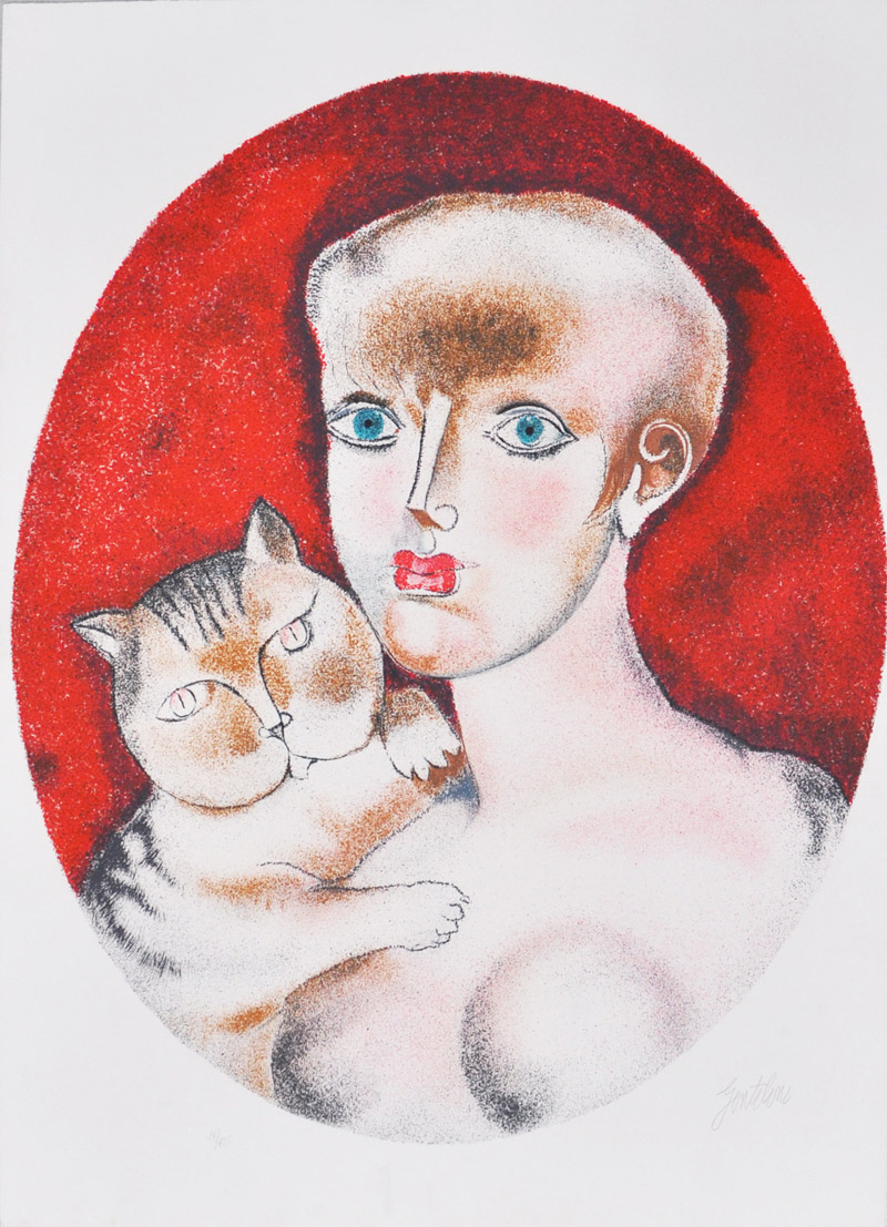 GENTILINI FRANCO Ragazza con gatto, 1980 litografia a colori es. 24/125 cm....