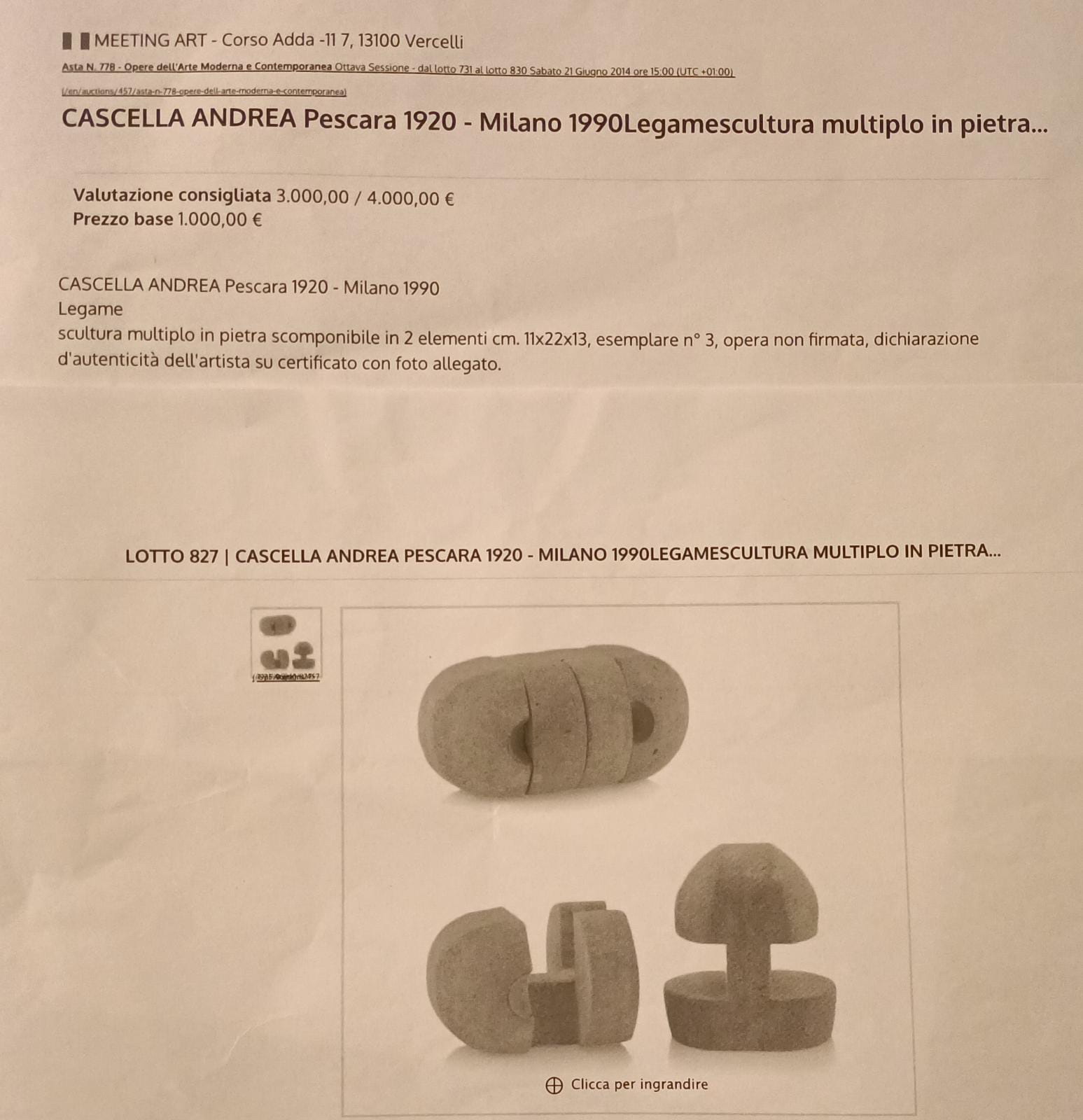 CASCELLA ANDREA Pescara (Ps) 1919 Legame 1990 Scultura in pietra , multiplo...