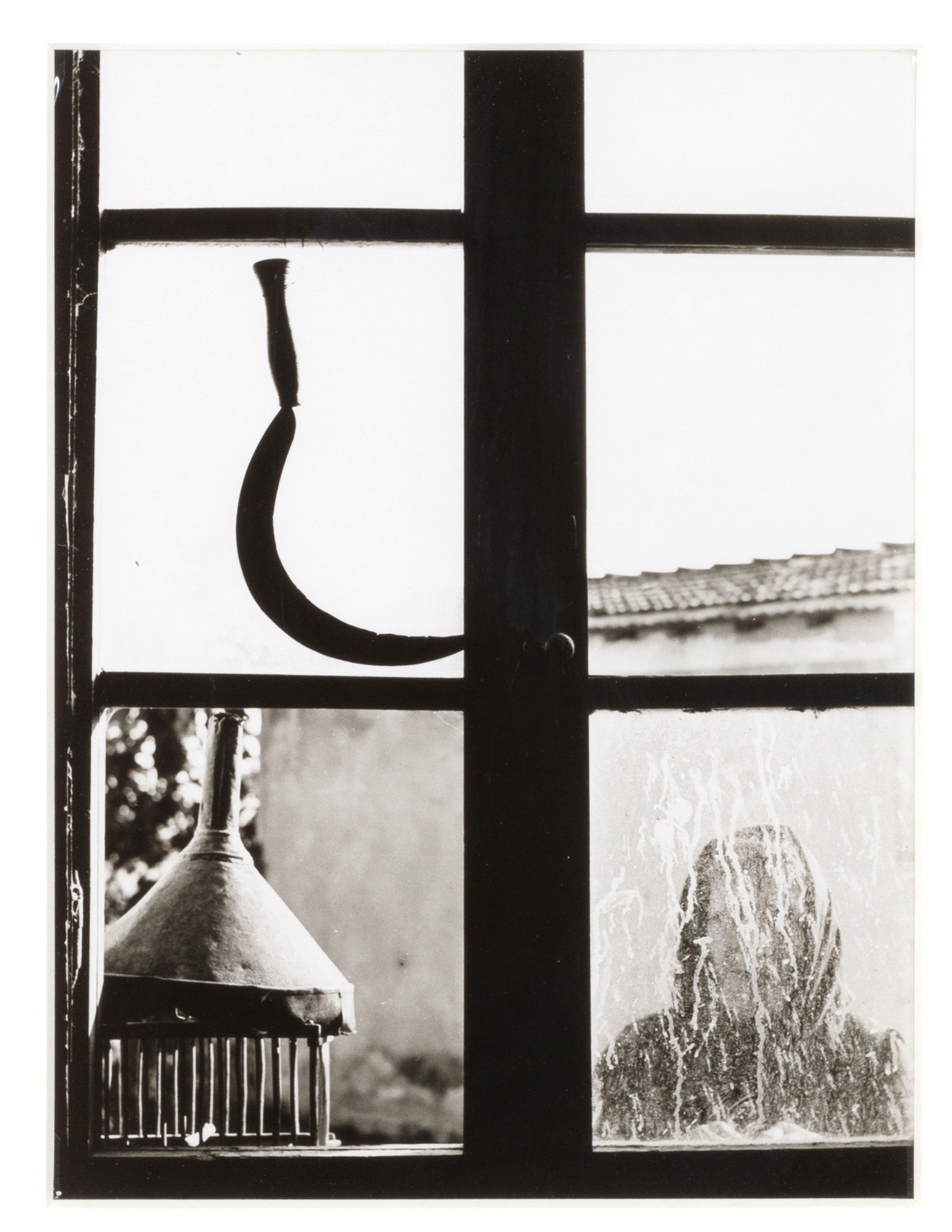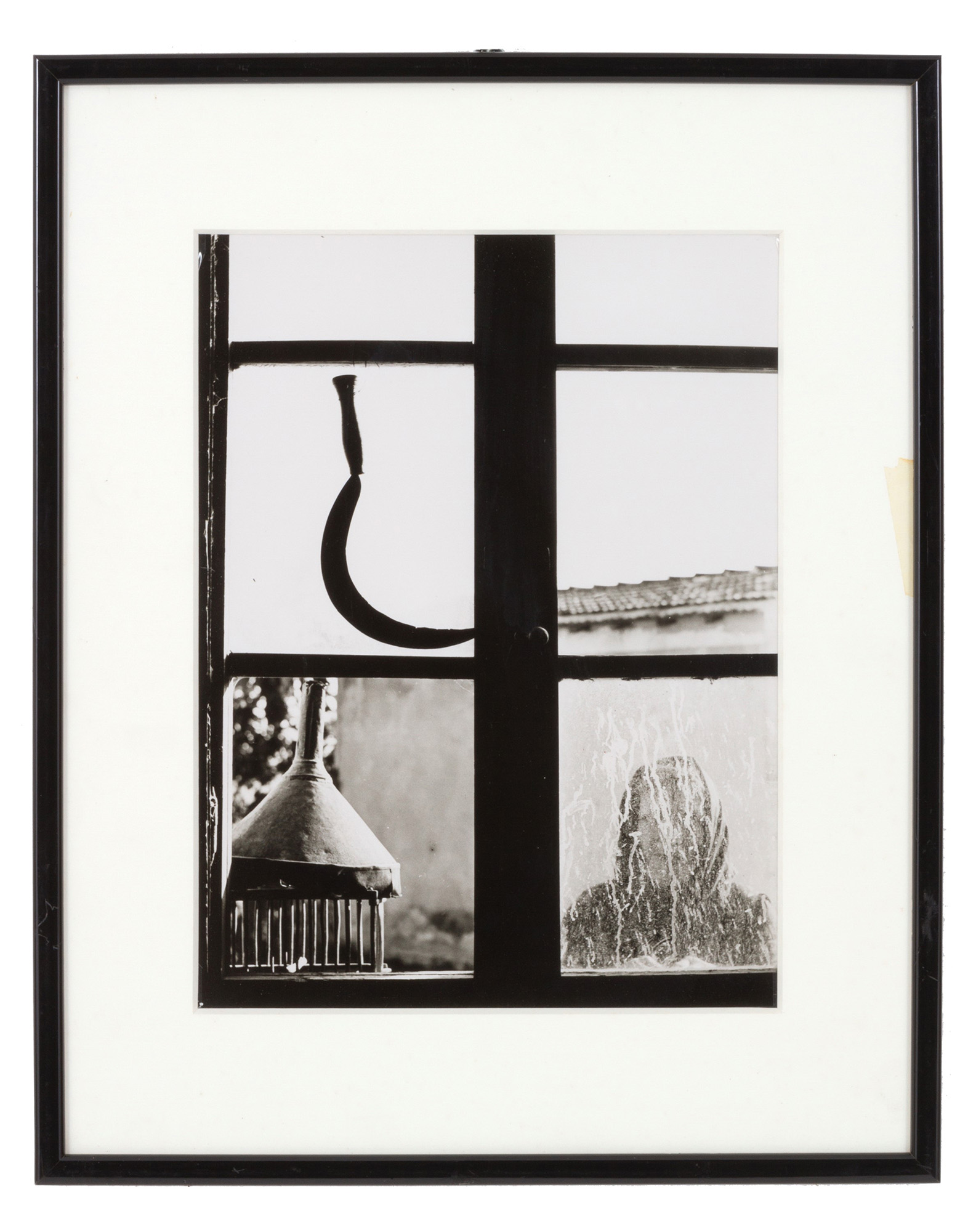 ALFREDO CAMISA (Bologna, 1927 - Pescia, 2007). Stampa alla gelatina ai sali d'argento, vintage, "FINESTRA CON GABBIA E IMBUTO, 1955". Firma, titolo e data a matita sul retro. 36,5x27,5 cm. ALFREDO CAMISA (Bologna, 1927 - Pescia, 2007). Vintage gelatin-silver print "FINESTRA CON GABBIA E IMBUTO, 1955". Signed, titled and dated in pencil on the back. 36,5x27,5 cm