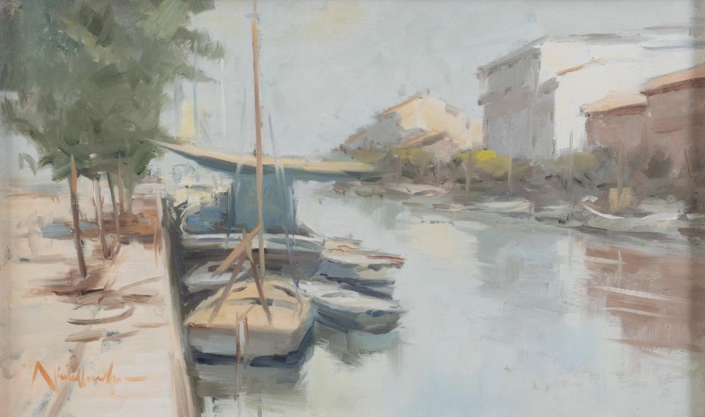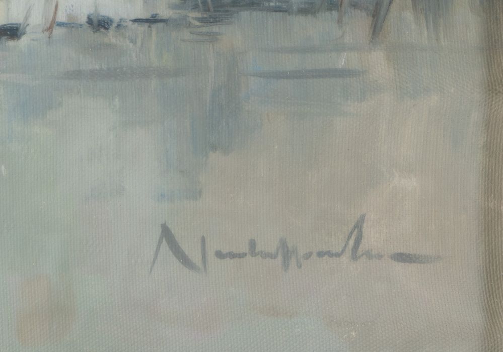 NICOLA SPONZA (Corfù 1914 - Trieste 1994) Coppia di marine. Olio su tela....