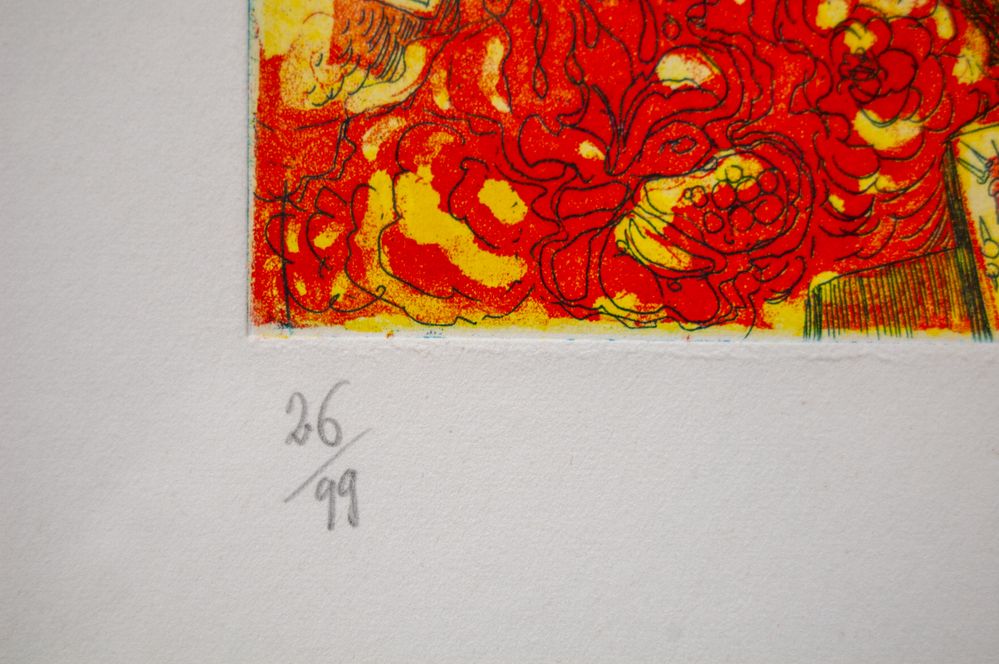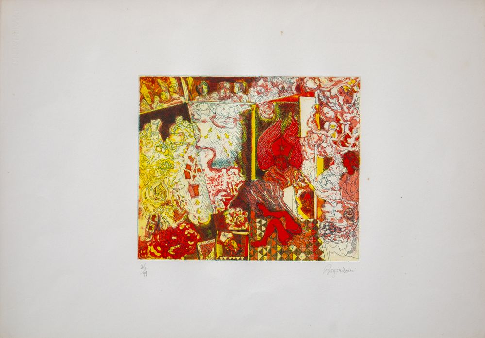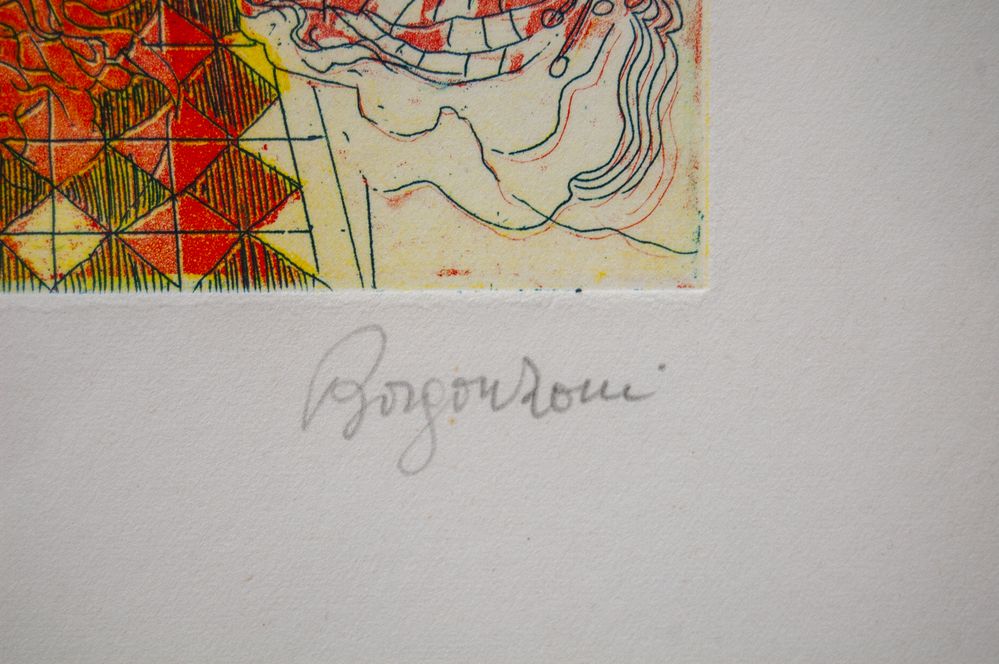 ALDO BORGONZONI (Medicina 1913 - Bologna 2004) "Senza titolo". Litografia a colori su carta. Lastra: cm 25,5x31. Foglio: cm 50x70. Opera firmata in basso a destra Borgonzoni. Reca numeri di tiratura in basso a sinistra 26/99.