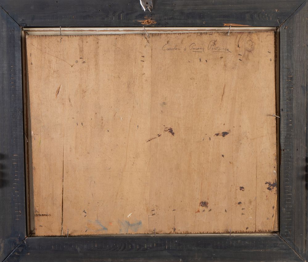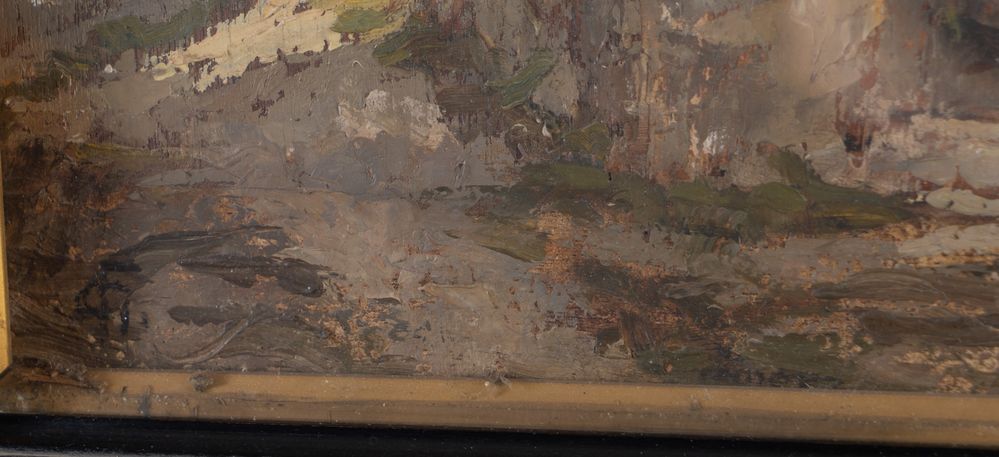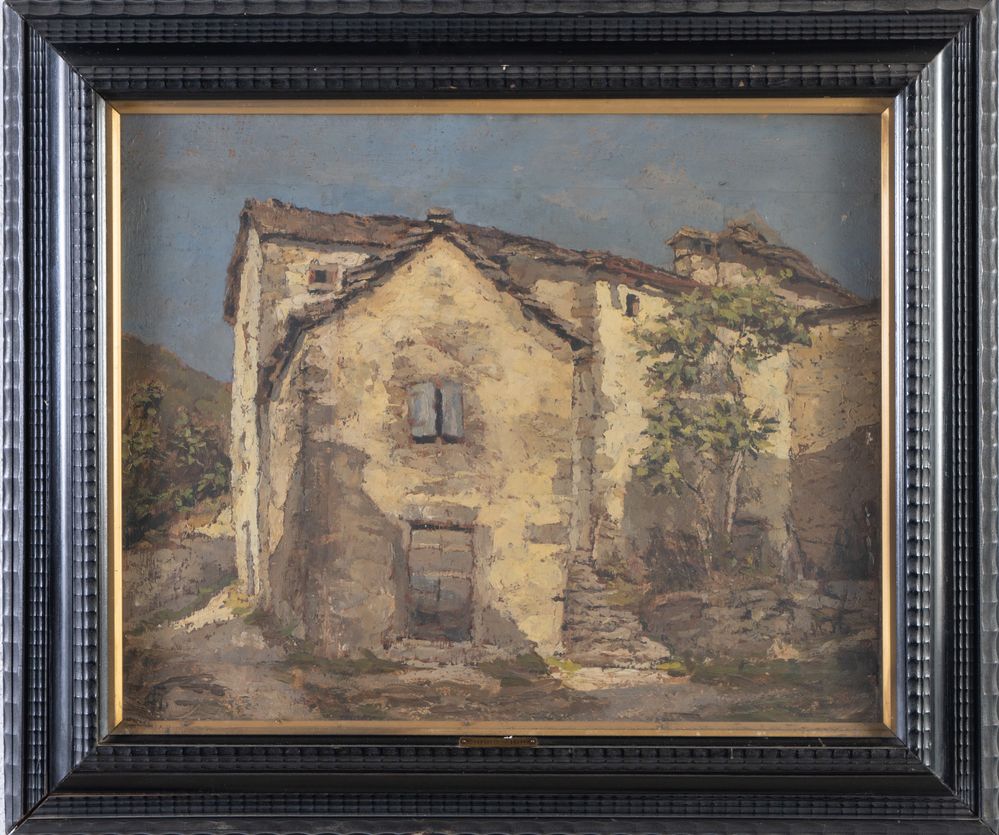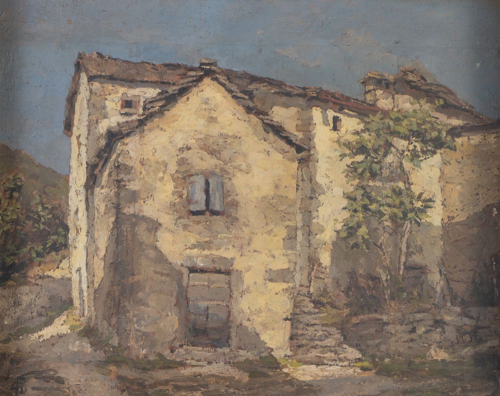 GIULIO FIORI (Bologna 1909 - 1991) "Casolari a Pavana Pistoiese". Olio su tavola. Cm 41,5x51,5. Opera firmata in basso a sinistra G. Fiori. Al retro opera intitolata Casolari a Pavana Pistoiese.