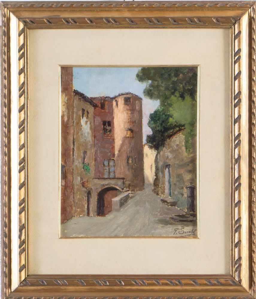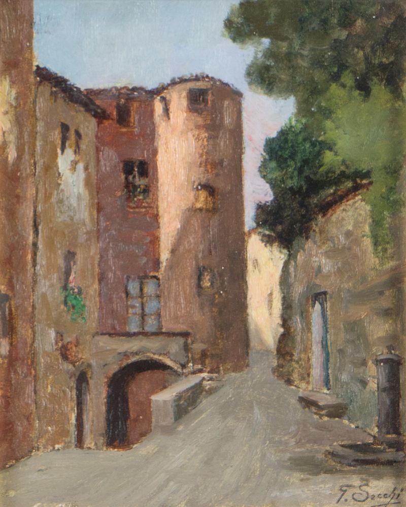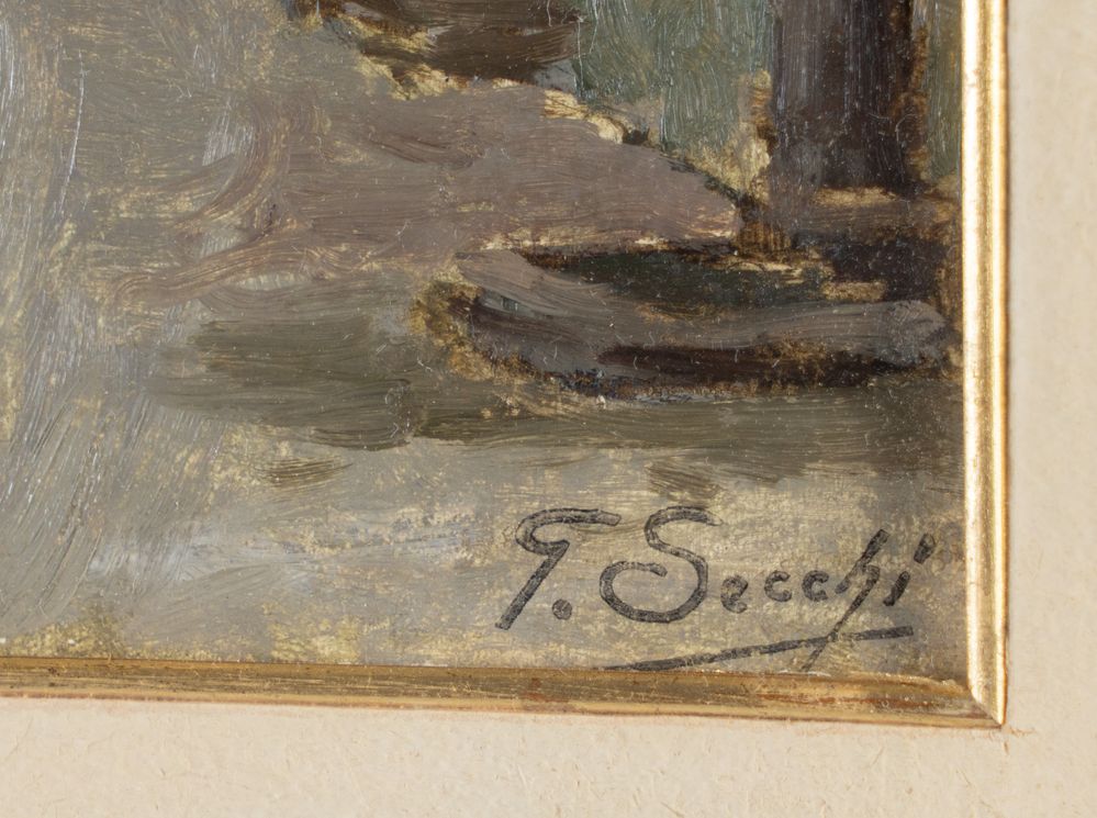 GIOVANNI SECCHI (Bologna 1876 - Darfo 1950) "Paesaggio". Olio su tavola. Cm 23,5x19. Opera firmata in basso a destra G. Secchi.