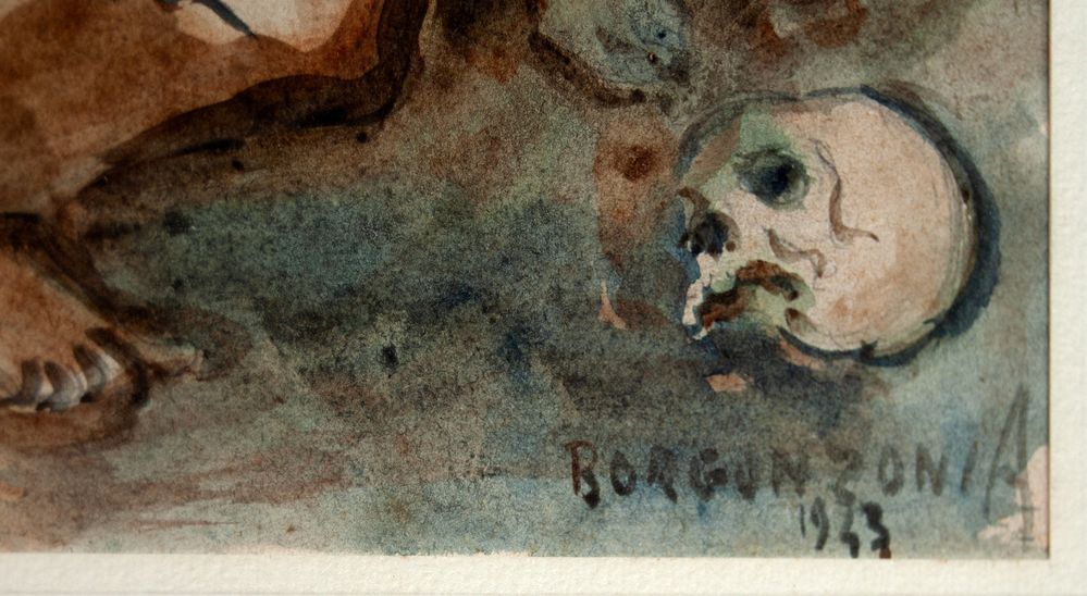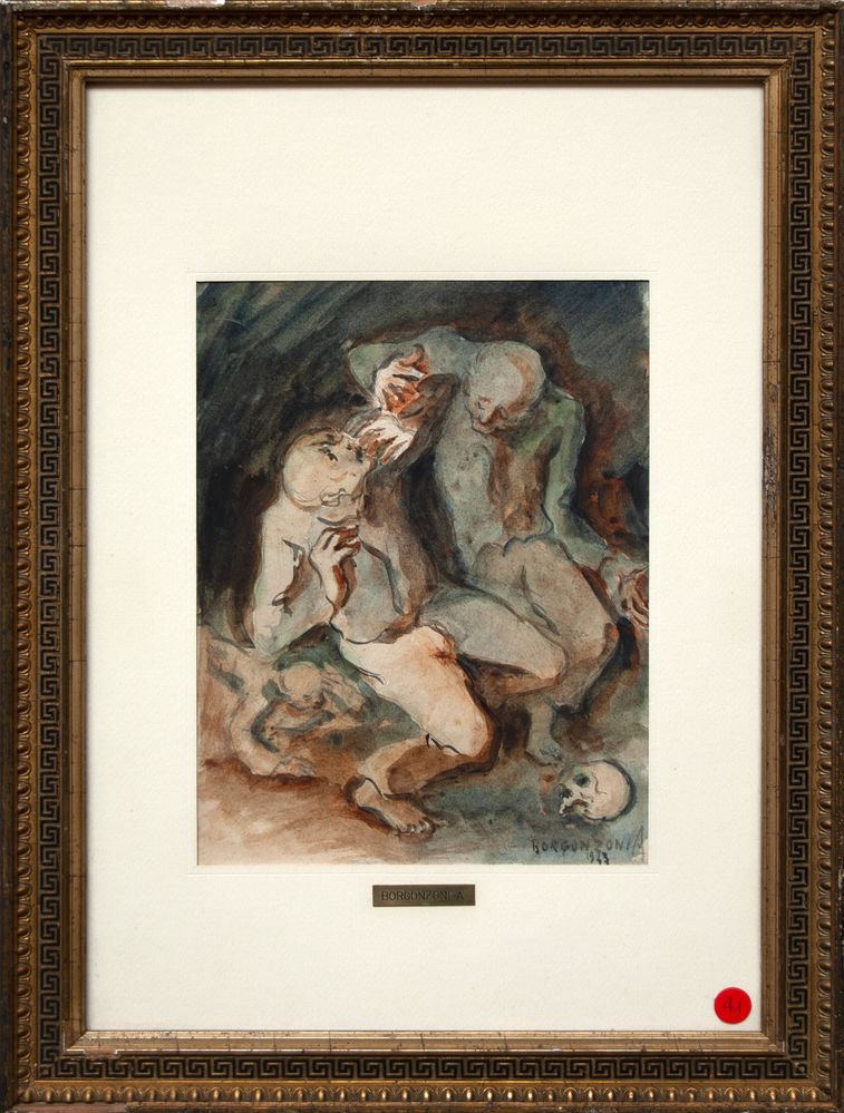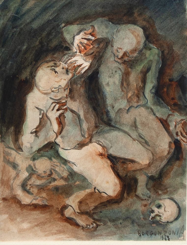 ALDO BORGONZONI (Medicina 1913 - Bologna 2004) "Senza titolo", 1943. Tecnica mista su carta. Cm 29,5x22. Opera firmata e datata in basso a destra Borgonzoni A 1943.