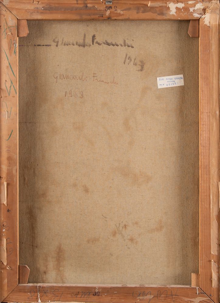 GIANCARLO FRANCHI (1929 - ?) Senza titolo, 1963. Olio su tela. Cm 69,5x50,5. Opera firmata e datata in basso a destra Giancarlo Franchi 1963. Al retro opera datata e firmata Giancarlo Franchi 1963. (difetti)