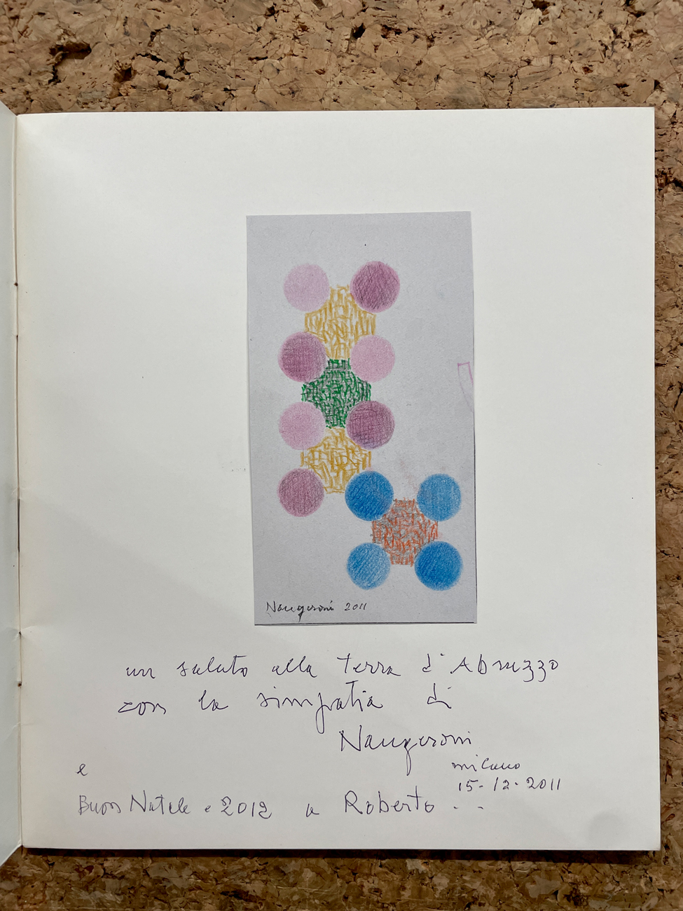 Reca un disegno a pastelli su carta, firmato e datato (2011), applicato all'interno