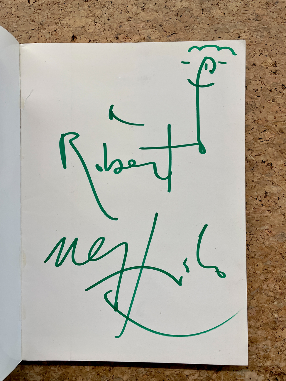 Reca firma, dedica e disegno dell'Artista a pennarello verde all'interno