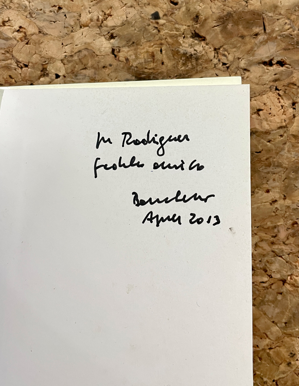 Reca firma, datazione (Aprile 2013) e dedica dell'Artista all'interno