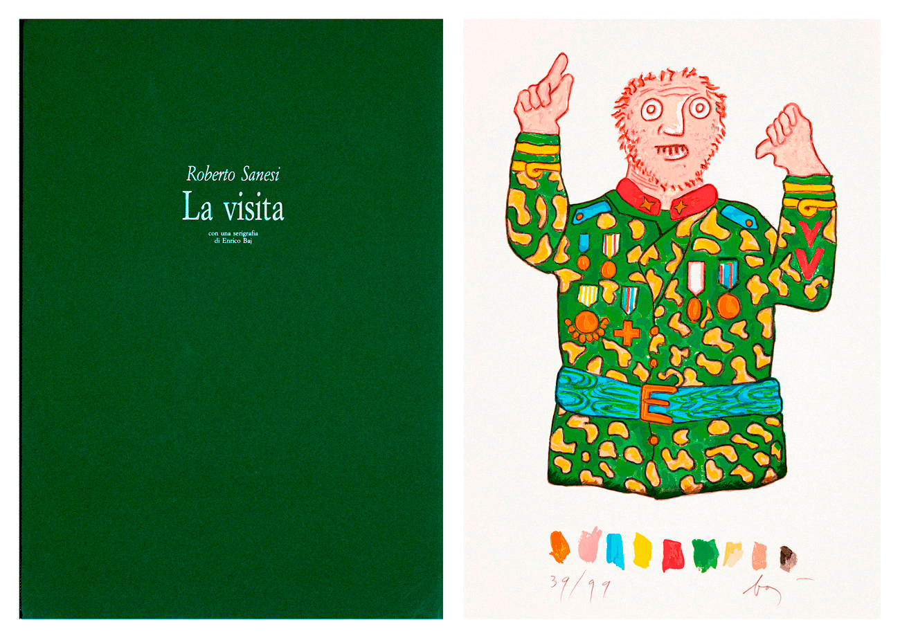 Cartella contenente testo di presentazione di Roberto Sanesi e una serigrafia polimaterica di Enrico Baj recante firma e numerazione (Esemplare 86/99) a matita al fronte
