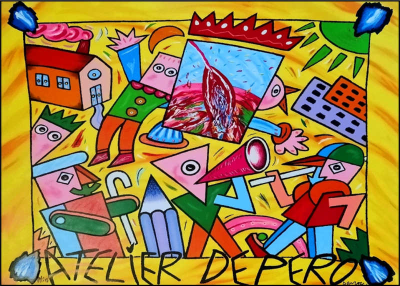 DONZELLI BRUNO Napoli 1941“Atelier Depero” serigrafia e smalti su cartoncino cm 70x50. Firmata sul fronte in basso a destra, tiratura 69/175 a sinistra. Sul retro certificato di garanzia a cura della Grafica d’Arte Lombardi.