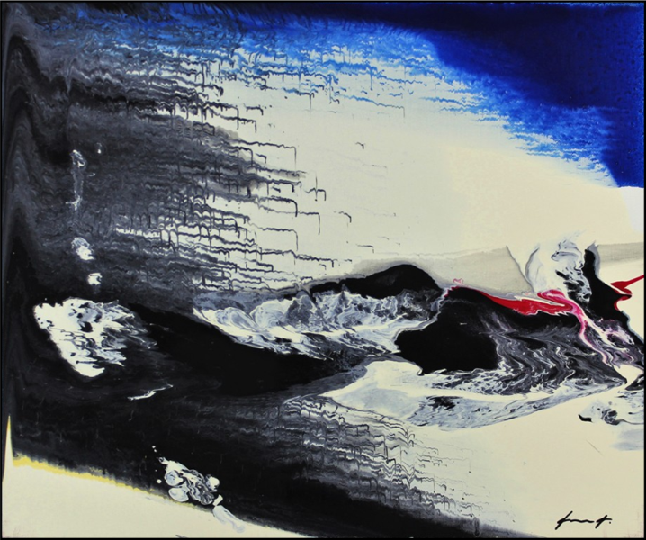 DE LUTTI PIERLUIGI Monfalcone 1959 “Lago rosso” tecnica mista su tela cm 60x50. Firmata sul fronte in basso a destra. Autentica dell’artista su foto.