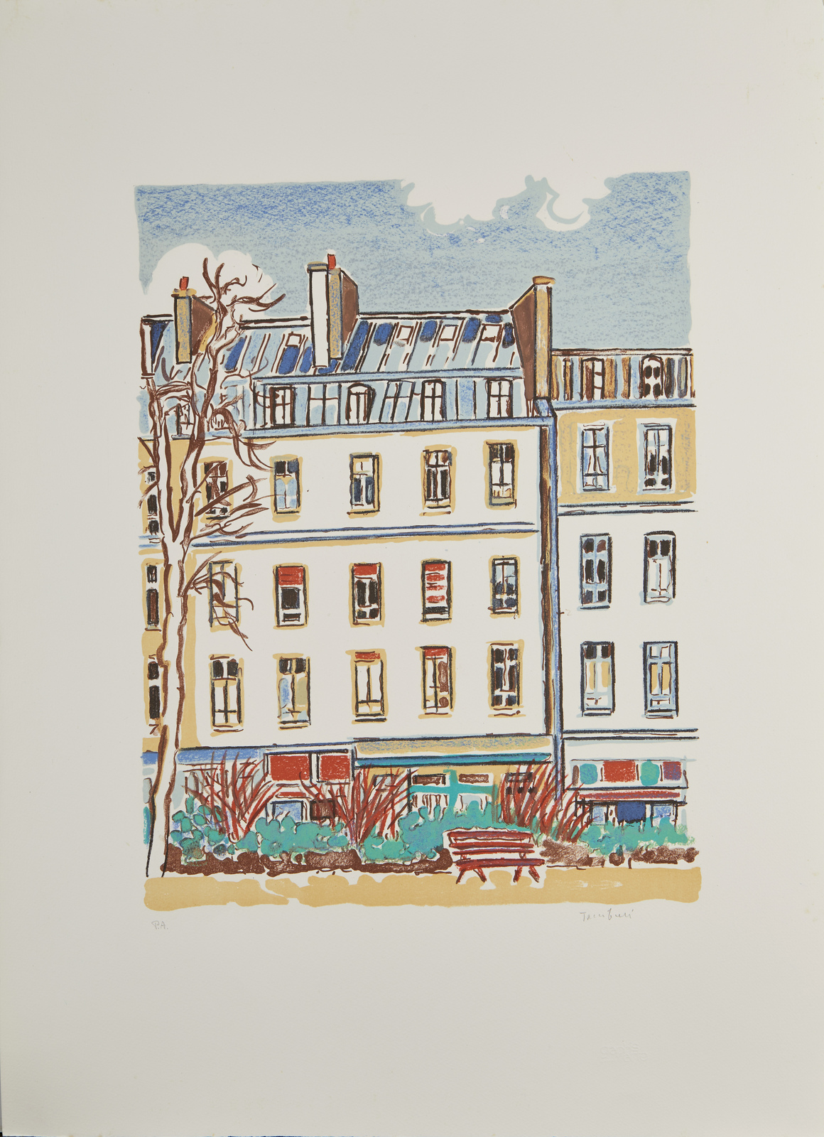 . Serigrafia. Cm 56,00 x 76,00. P.A. Tiratura e firma in basso a matita. Timbro a secco Graphis Arte, Livorno, in basso a destra. Lievi difetti.