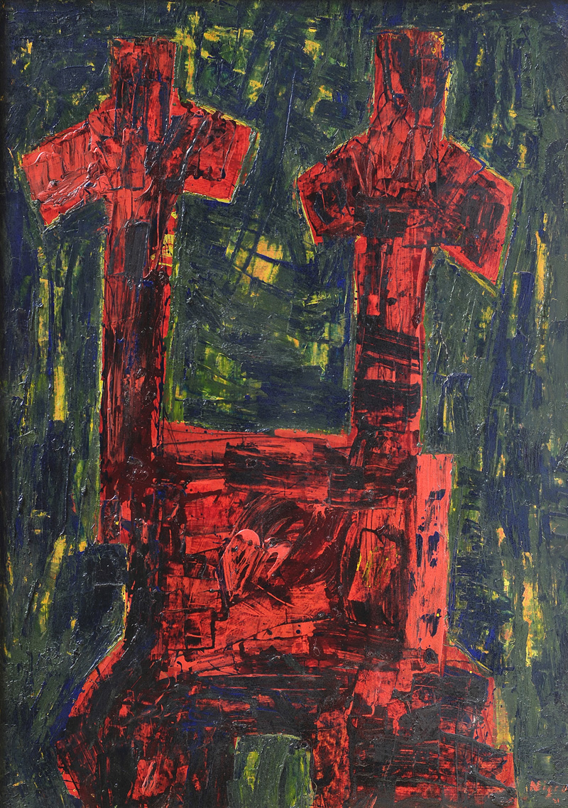 Mario Nigro (Pistoia, 1917 - Milano, 1992) SENZA TITOLO, 1961 Olio su cartone riportato su tela, cm. 100,5x70,5 Firma e data in basso a destra. Autentica dell’autore su foto.