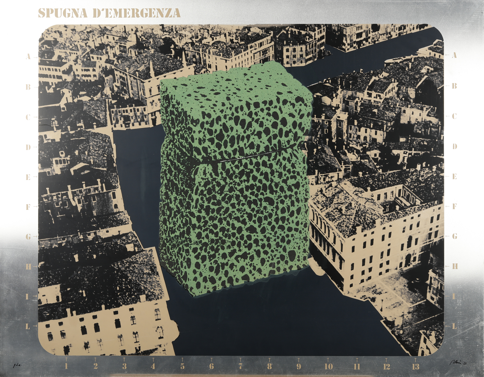 PLESSI FABRIZIO (n. 1940) Spugna d'emergenza- Venezia. 1973. Serigrafia su lastra di acciaio. Cm 85,50 x 66,50. P.d.a. Tiratura, firma e anno in basso.