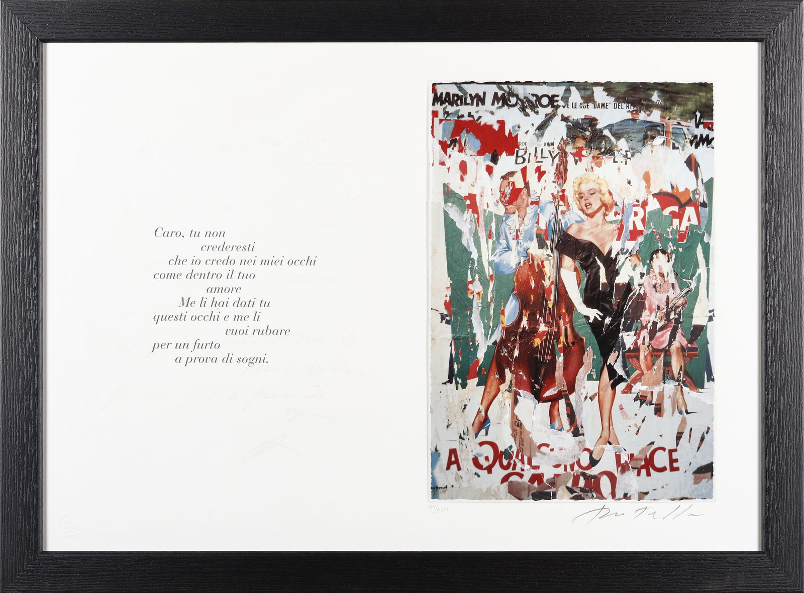 ROTELLA MIMMO (1918 - 2006) A qualcuno piace caldo. 2005. Decollage. Cm 70,00 x 50,00. XV/XLIII. Tiratura e firma in basso a matita.Grafica proveniente dal volume "Marilyn Bellezza eterna”, di Mimmo Rotella e Alda Merini. Ogni foglio è abbinato ad una poesia inedita di Alda Merini.