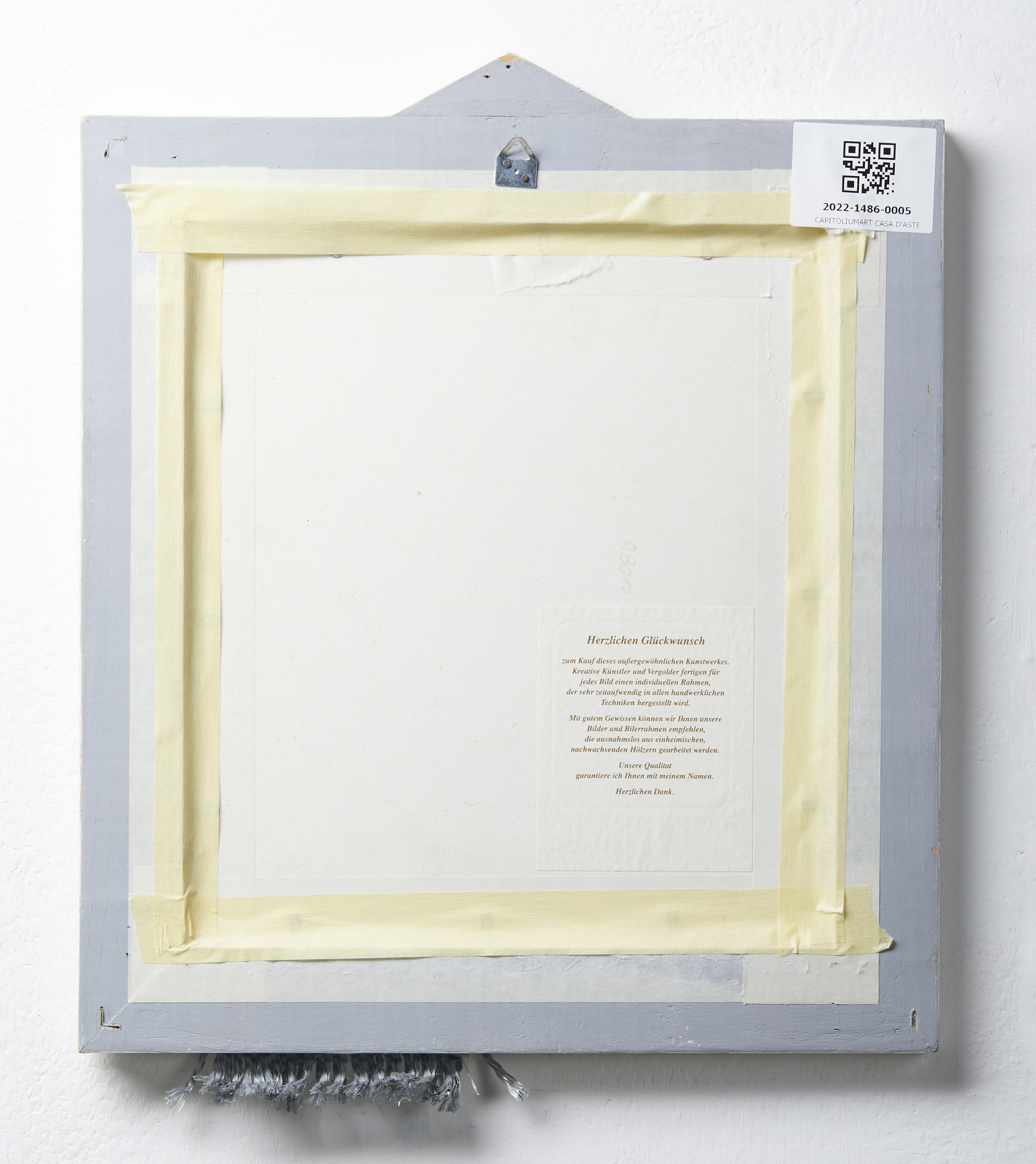 CHRISTO' (n. 1935) & JEANNE-CLAUDE (1935 - 2009) Wrapped Reichstag, Project for Berlin, Collage in Two Parts, 1994. 1995. Cartolina e tessuto. Cm 11,50 x 16,50. Firma in alto al centro a pennarello. Editore: Benedikt Taschen, Verlag GmbH, Koln. Presente pezzo di tessuto. Cornice presente