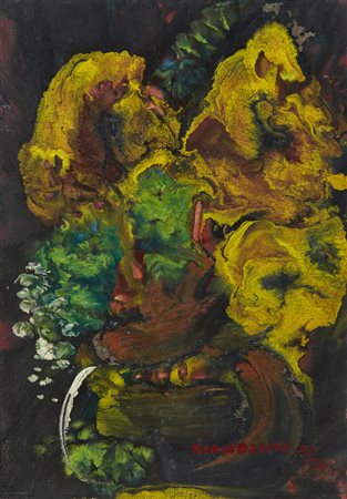 GIANDANTE X (1900 - 1984) Composizione floreale. 1974. Encausto su cartone. Cm 50,00 x 35,00. Firma e anno in basso a destra. Certificato di autenticità rilasciato da Peter Gallery, Brescia. Difetti,