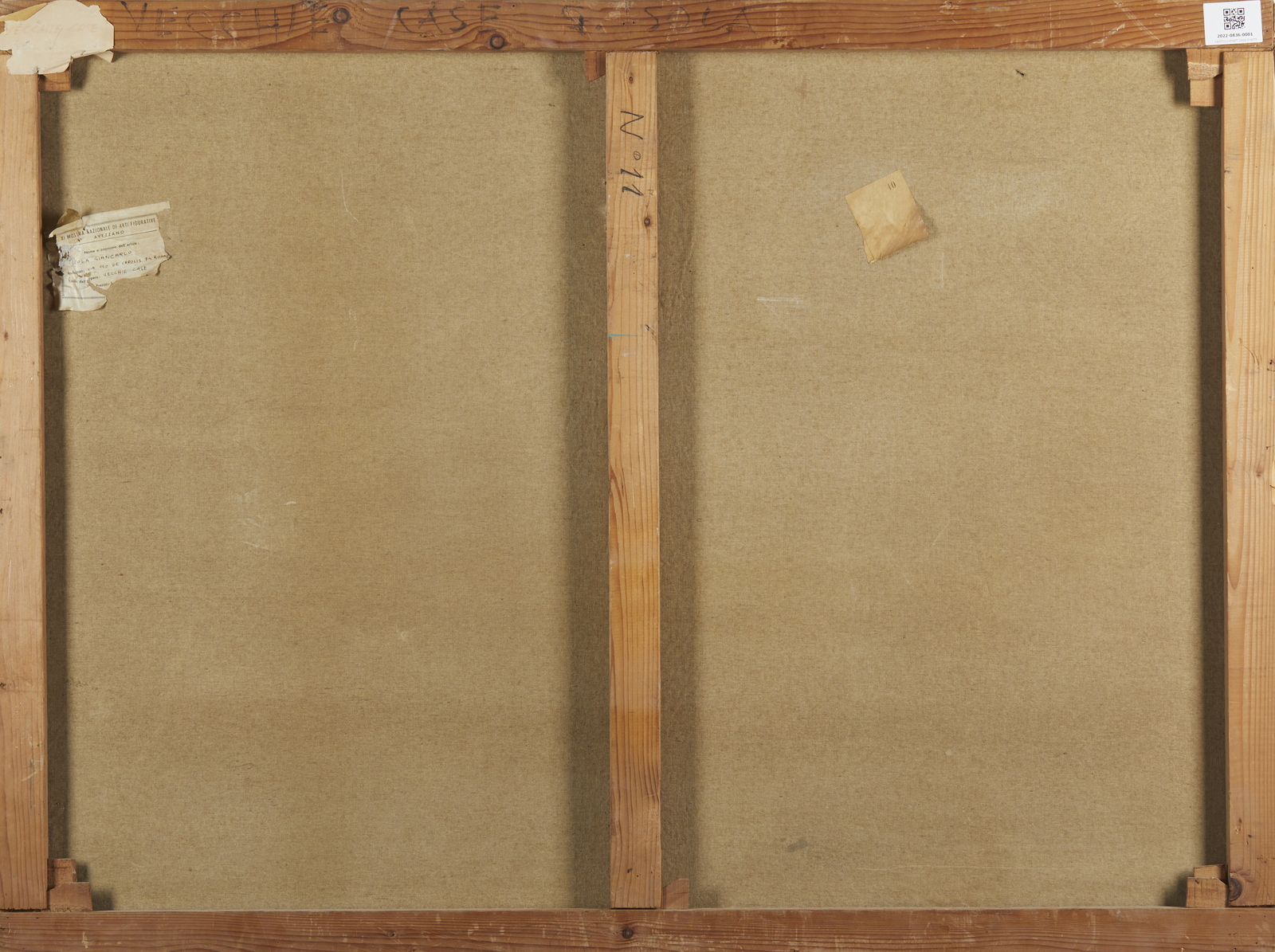 ISOLA GIANCARLO (n. 1927) Vecchie case. Olio su tela . Cm 120,00 x 90,00. Firma in basso a destra. Al retro titolo e cartiglio descrittivo della XI Mostra Nazionale di Arti figurative, Avezzano. Difetti.