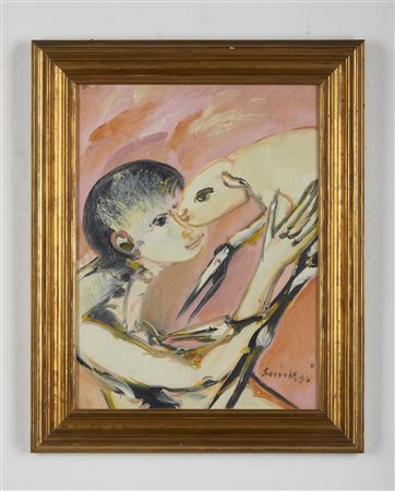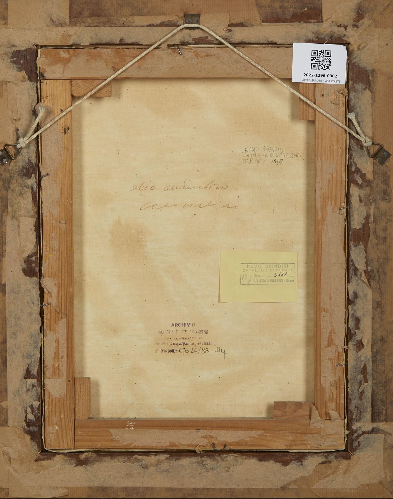 BRINDISI REMO (1918 - 1996) Senza titolo. Olio su tela . Cm 30,00 x 40,00. Firma in basso a destra. Al retro firma, cartiglio Galleria Pace, Milano e timbro Archivio Galleria d'arte Parametro, Roma. Opera archiviata presso la Galleria Pace, Milano, come da documentazione fotografica allegata all'opera riportante il relativo numero d'inventario. Provenienza: Galleria Parametro, Roma; Collezione privata, Roma. Cornice presente