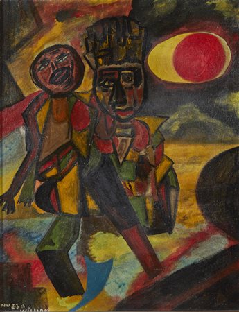 NUZZO WILLIAM (n. 1930) Il Re Sole. 1970. Tecnica mista su tela. Cm 40,00 x 50,00. Firma in basso a sinistra. Al retro titolo, firma, dedica, anno e cartiglio descrittivo. Lievi difetti. Cornice presente