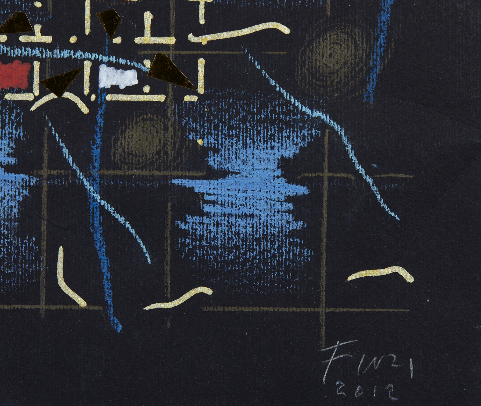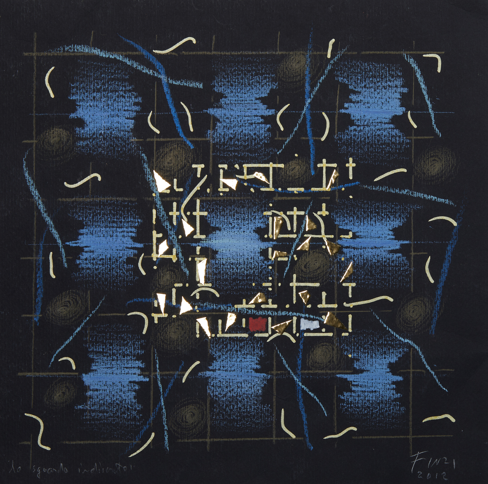 FINZI ENNIO (n. 1931) Lo sguardo indiscreto. 2012. Tecnica mista e collage su carta. Cm 33,50 x 33,50. Titolo, firma e anno in basso a matita. Autentica dell'artista su fotografia.