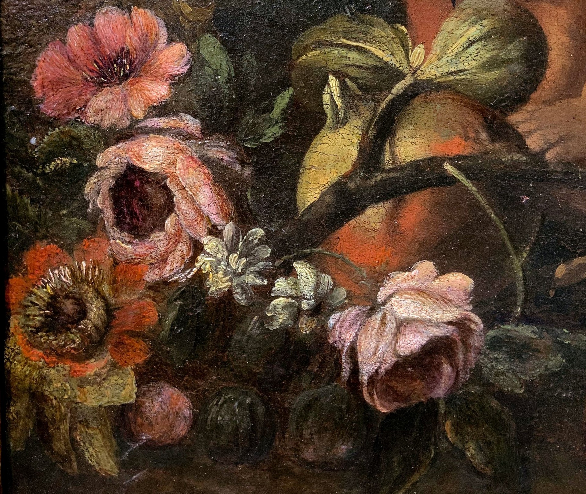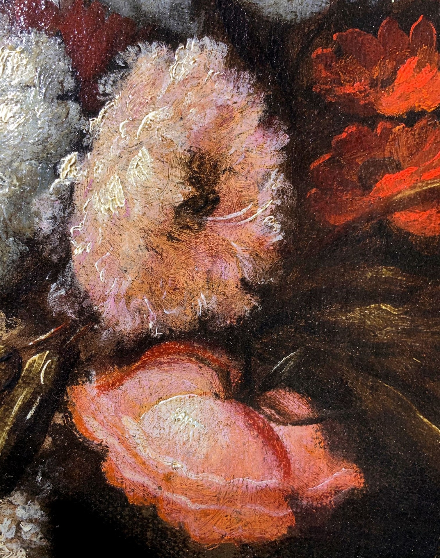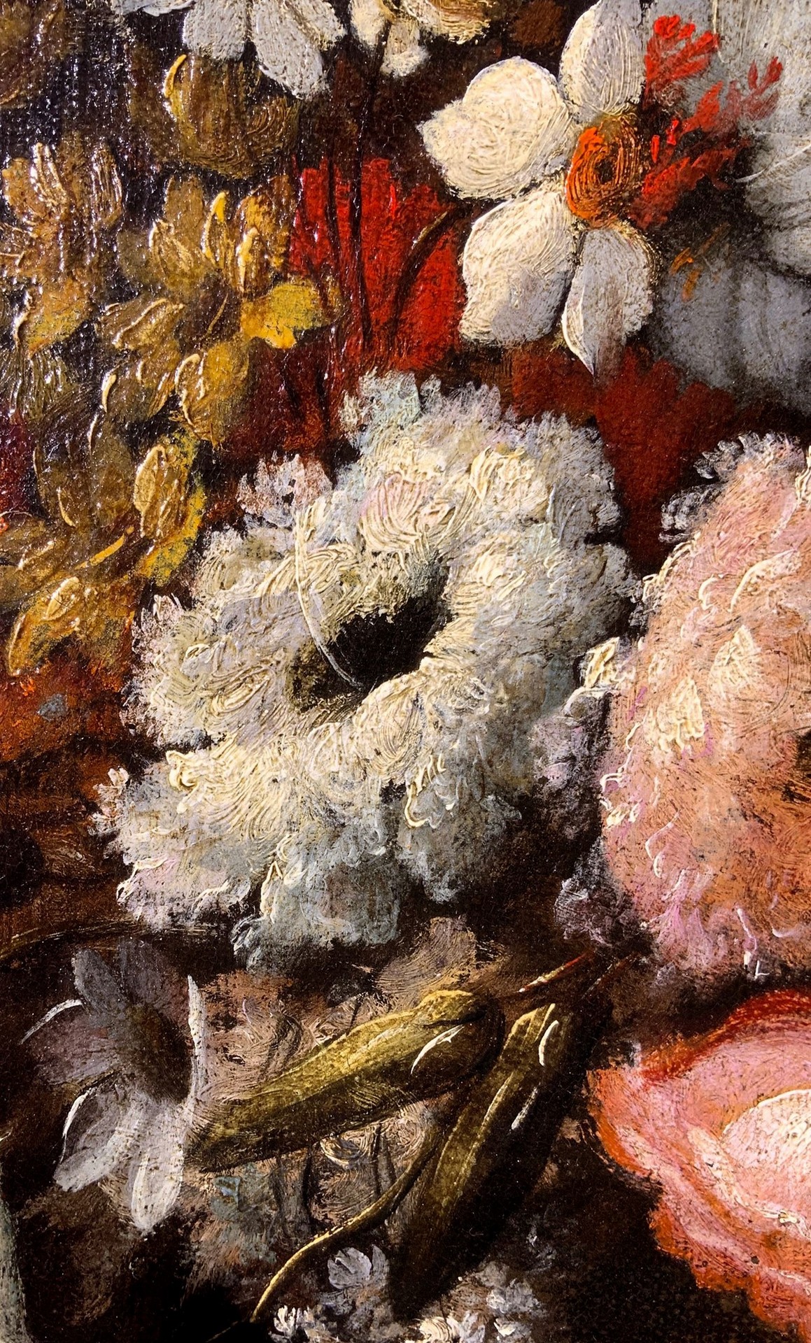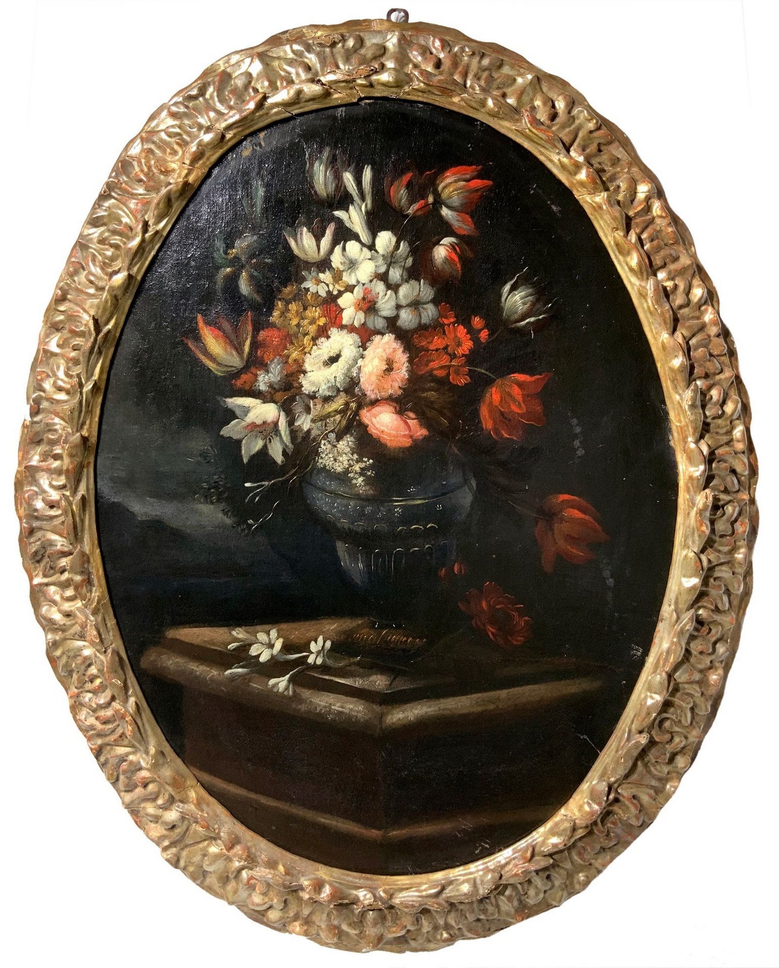 Mario de' Fiori Mario Nuzzi (attribuito_a) (Roma 1603-Roma 1673) - Trionfo di fiori in vaso di bronzo su piano di pietra, XVII secolo cm 100 x cm 75 Dipinto a olio su tela Le opere singole del pittore realizzate per le committenze più importanti sperimentano un nuovo stile elegantissimo e ricco, teso a svincolarsi da un repertorio strettamente botanico e didattico. In quest'opera il pittore rafforza la propria inventiva raggiungendo il più alto livello qualitativo con raffinate composizioni floreali in vaso singolo. Il nucleo centrale: delfinium, tulipani, garofani, rose ecc emanano una luce centrale che li rende vivi e leggeri come piume a cui fa riscontro la sensibilità e l'estetica caravaggesca del pittore mettendo in ombra chiaroscurale i fiori retrostanti. In tal modo risulta impreziosita la felicità cromatica del primo piano. Tipico di Mario dè Fiori: il caravaggismo ereditato dal Salini, l'impronta espositiva , il dettagliato descrittivismo dei fiori permeato da un cromatismo luministico. Inoltre appare evidente il riferimento alla tradizione dei maestri fiammingi e olandesi della fine del '500. Nonostante l'impostazione frontale del dipinto, l'ariosa disposizione dei fiori conferisce una profondità spaziale ed un'ampiezza di respiro alla composizione floreale. Ovale in cornice coeva in legno dorato.