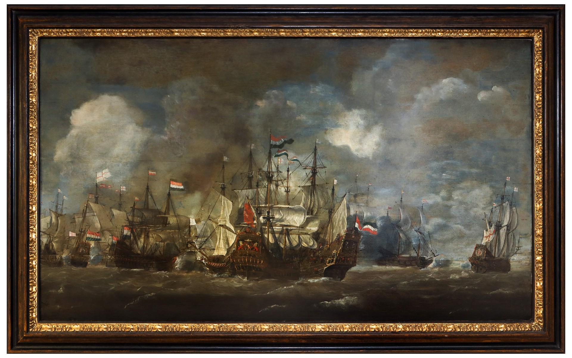 cm 90x155, in cornice cm 111x177 Olio su tavola. Pittore olandese del XVII secolo specialista in marine. Ritratta una scena della Prima o Seconda guerra anglo-olandese, in cui la flotta inglese, alleata della Repubblica Genovese, metteva accanto alla propria bandiera quella della Croce di San Giorgio per non subire attacchi dagli alleati.