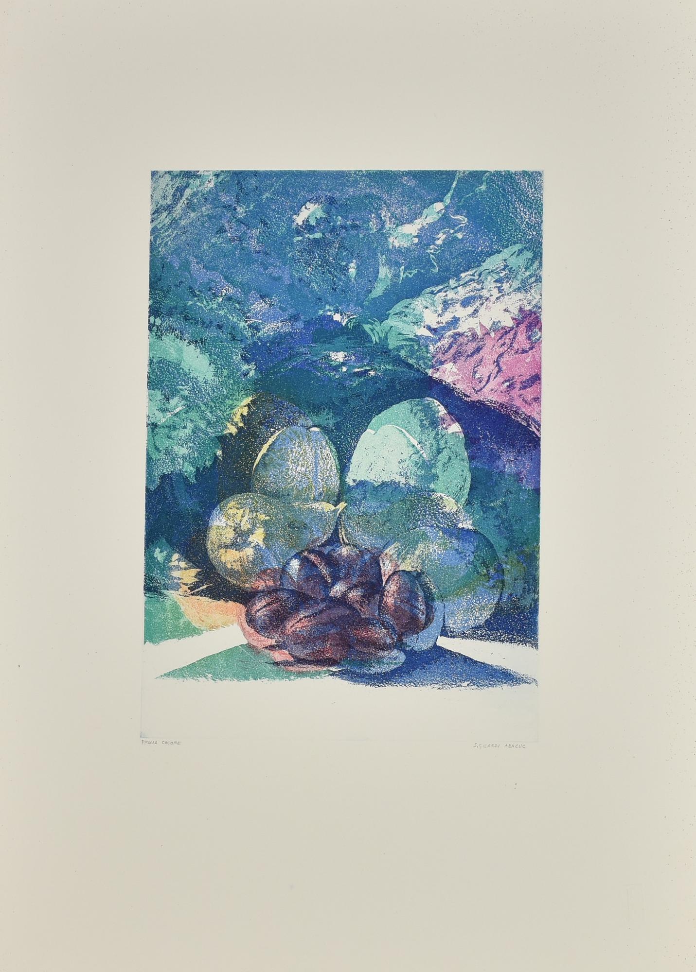 Acquatinta a colori, mm 395x275, su foglio cm 69,5x50; es. Prova colore