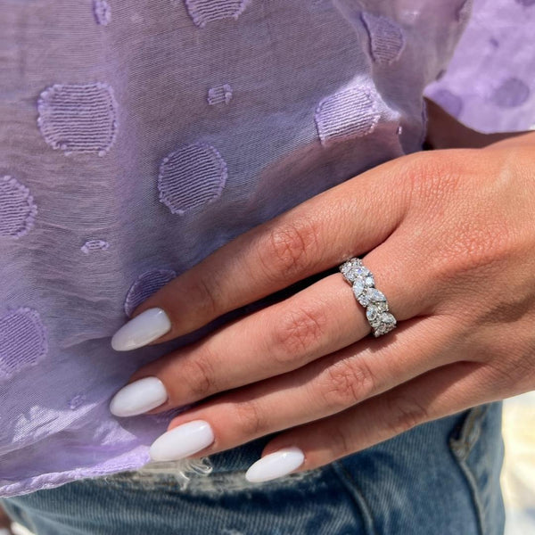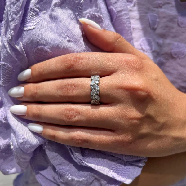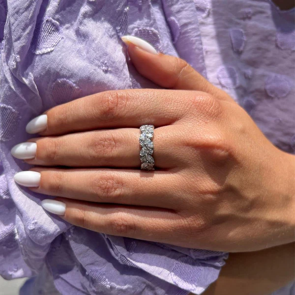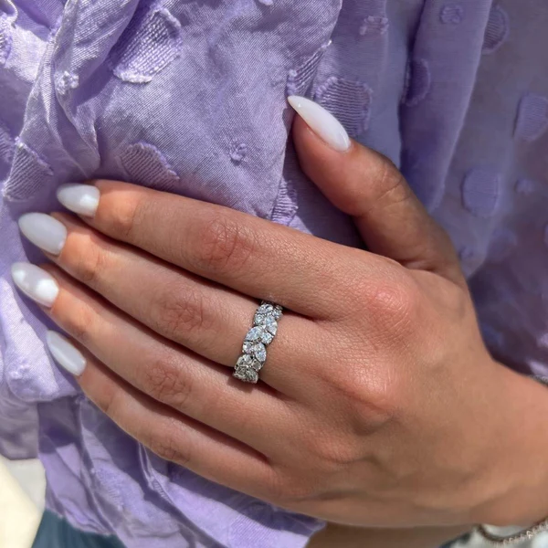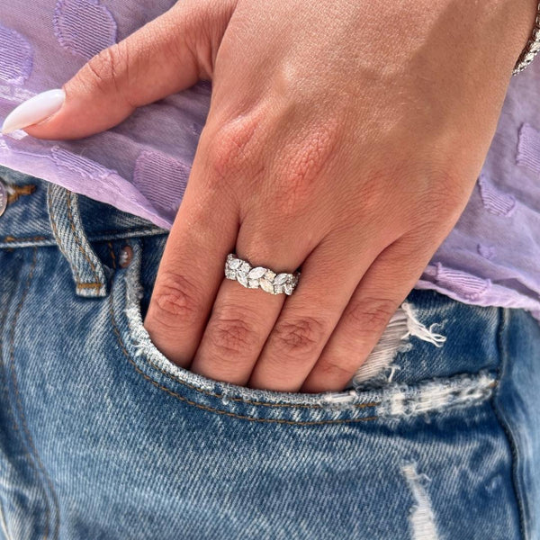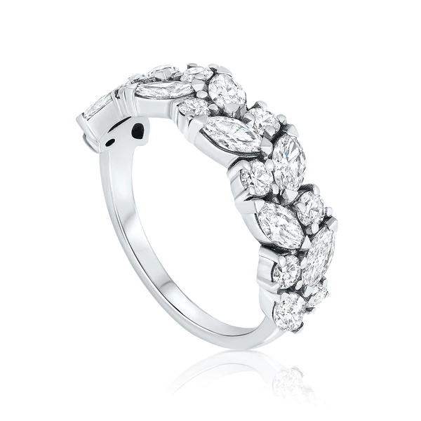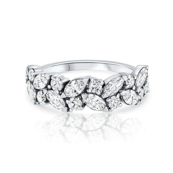 Abbagliante e brillante, questa fede nuziale unica nel suo genere ha tutto. Progettato in oro bianco 14 carati, l'anello è incastonato con un mix di autentici marquise e diamanti di forma rotonda che si intrecciano per creare un look audace e scintillante. Fai brillare il tuo dito! L'anello è tempestato di 16 diamanti per un totale di 1,80 carati. - CP50124