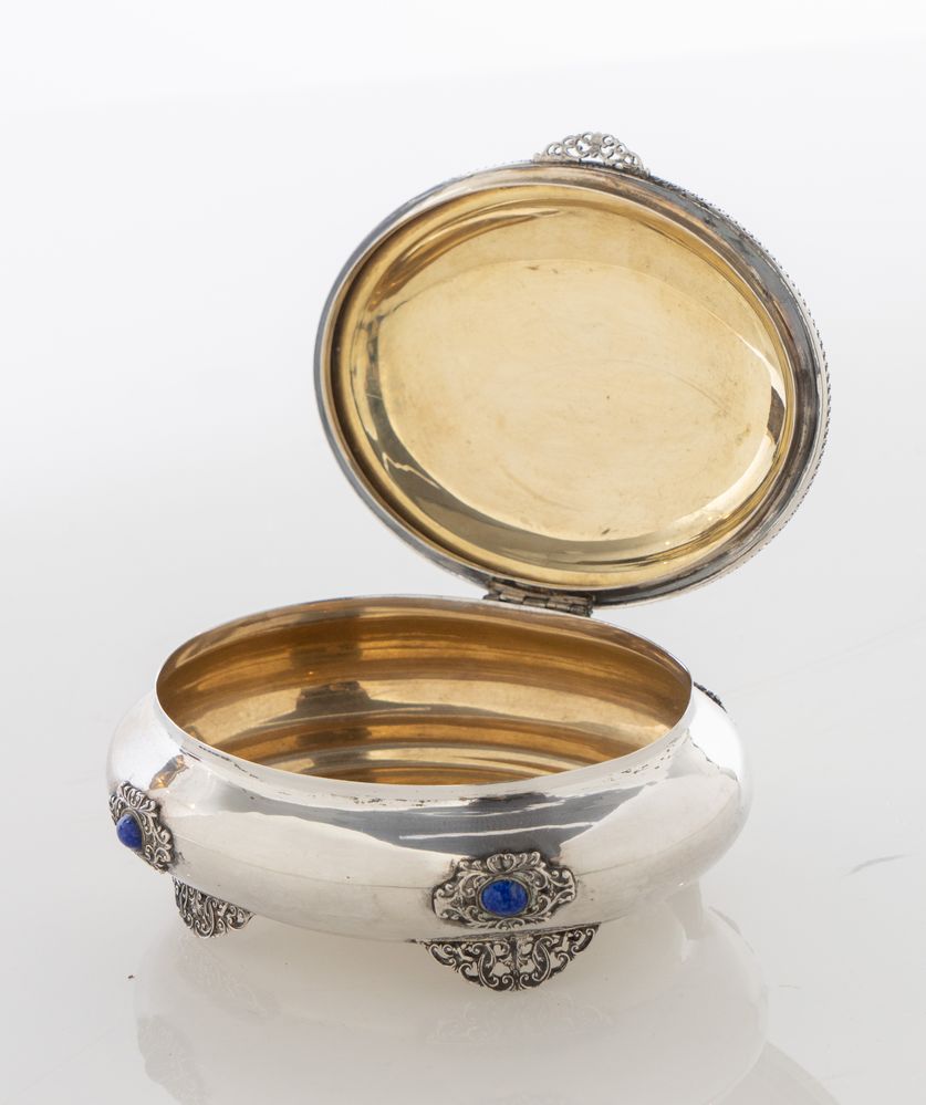 TADIELLO GAETANO, Milano, XX secolo. Scatola in argento 800 con pietre dure. Interno vermeille. Sotto la base reca punzoni: 800 e MI515. Cm 7,5x15x12. Peso: 286 gr.