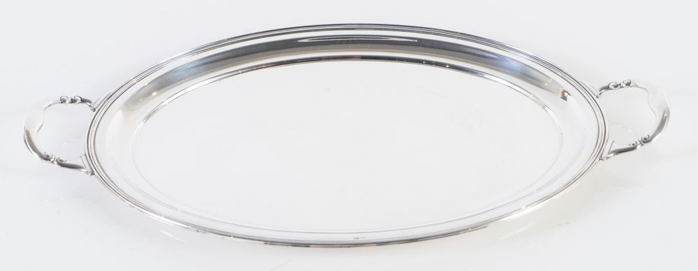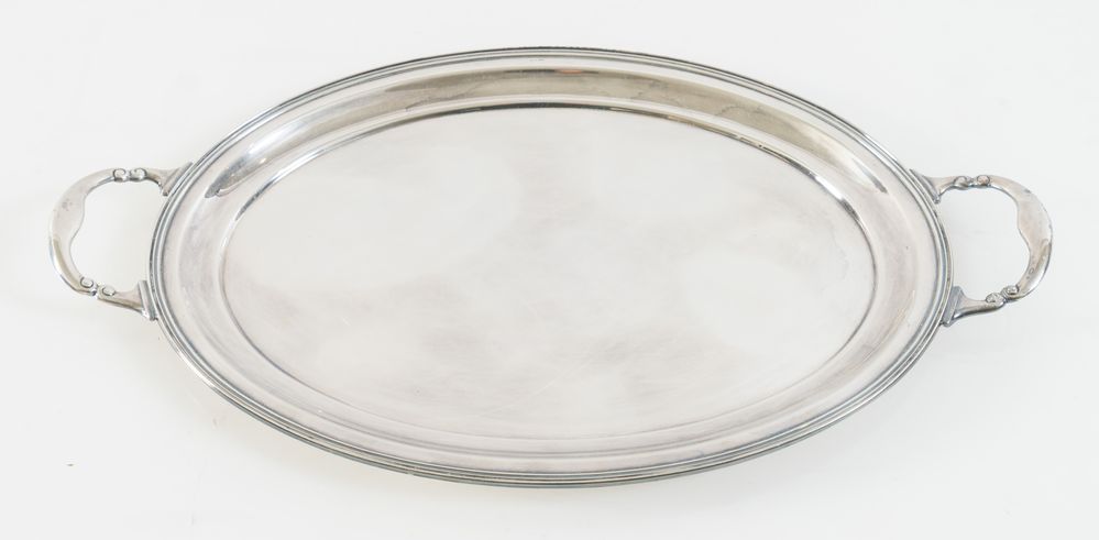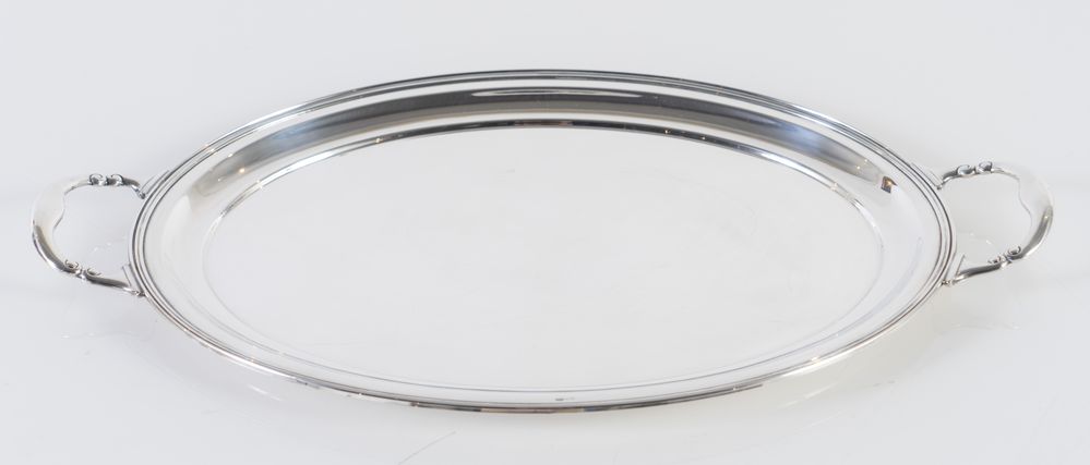 Italia, dal 1968. Vassoio in argento 800. Sul bordo inferiore reca punzoni: 800 e losanga locativa non identificata. Cm 49x30x2. Peso: gr 924,33.