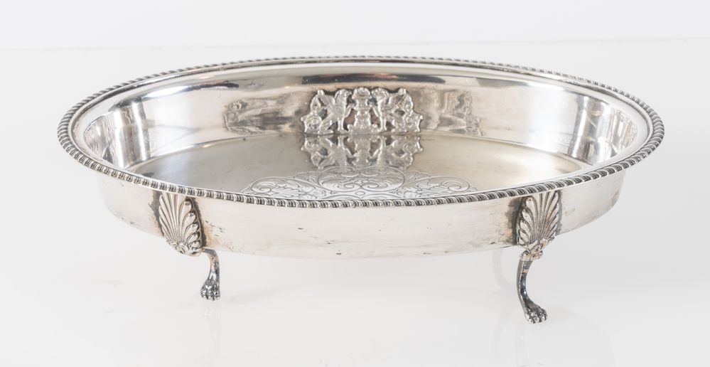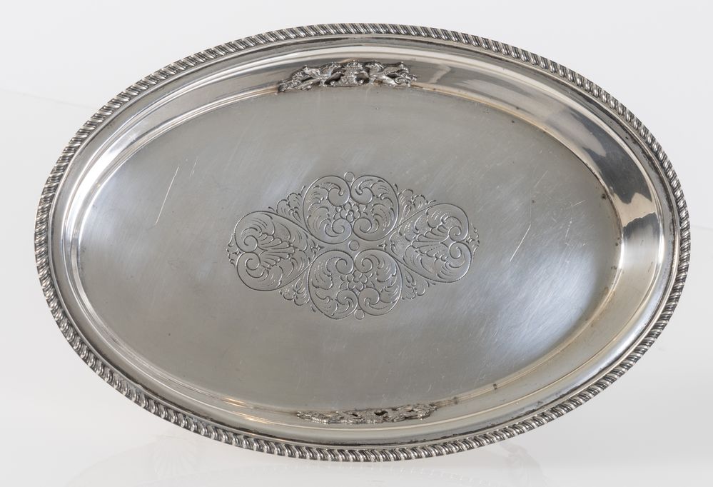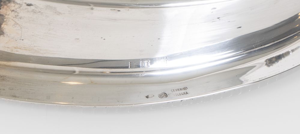 Italia, metà XX secolo. Alzata in argento 800 con centro decorato. Sul bordo inferiore reca punzioni: losanga locativa non identificata, 800 e Cevenini, Bologna. Cm 7x26,5x17,5. Peso: 478 gr.