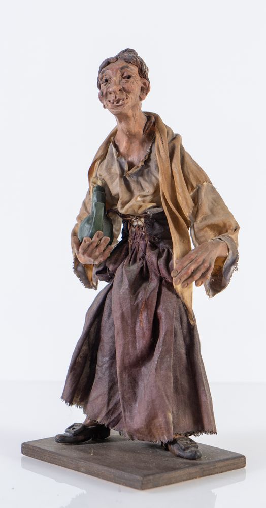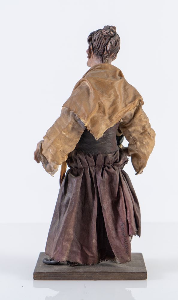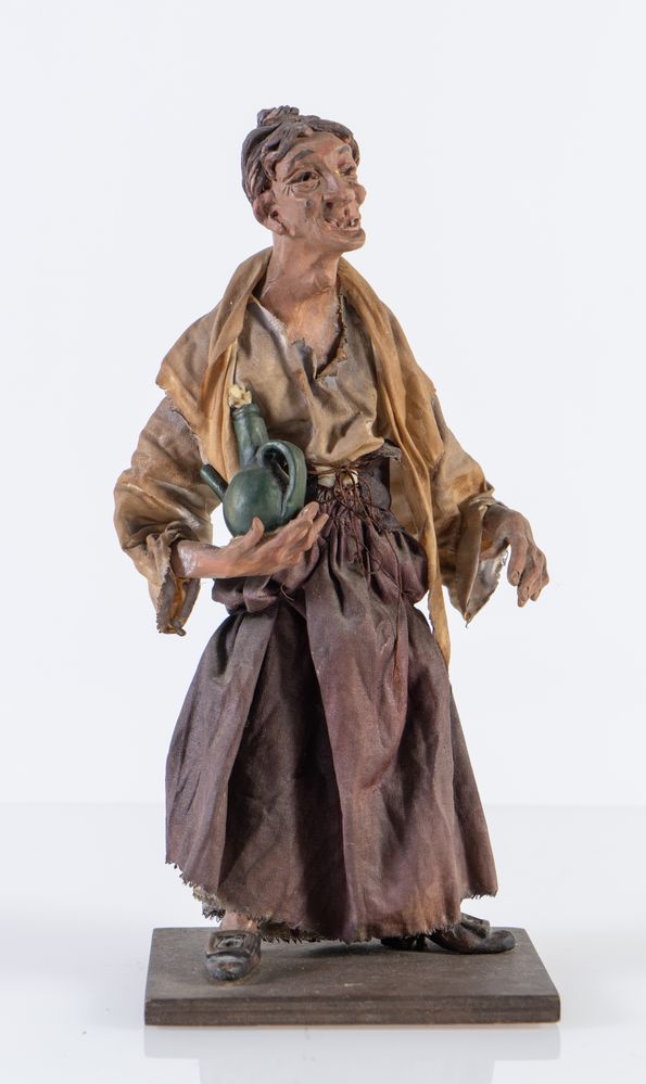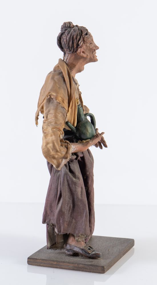 "Anziana con brocca". Figura di presepe. Scultura in terracotta con abiti in...