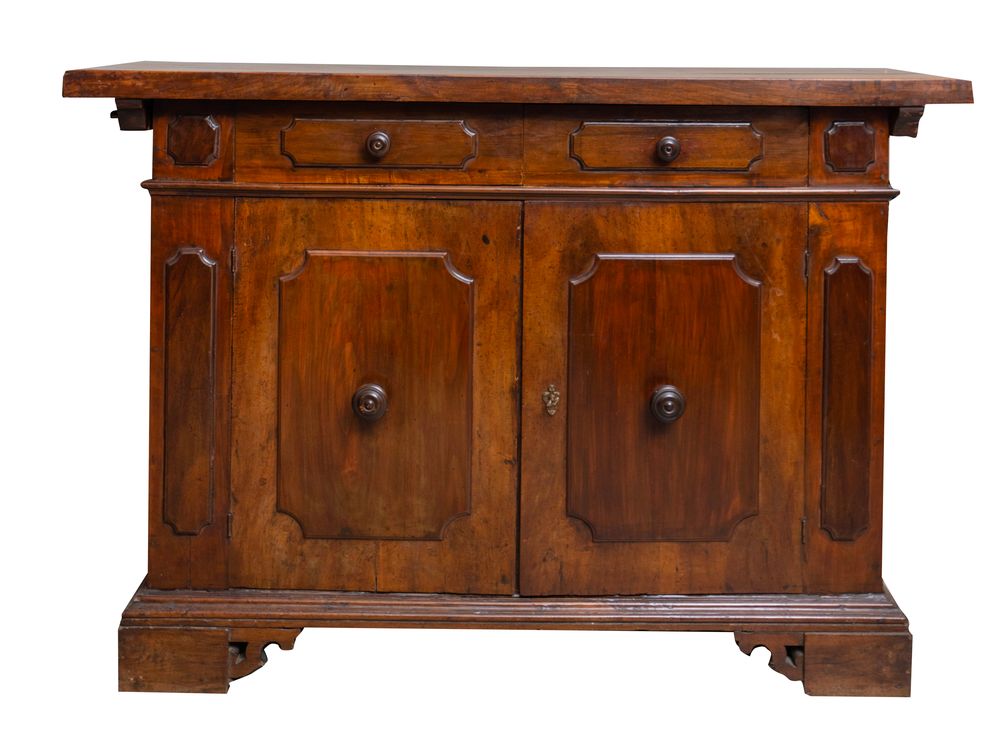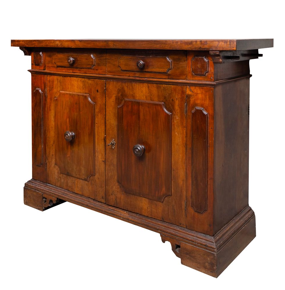Credenza in massello di noce. Bologna, XVII secolo, ma ridotto nelle misure. Reca due ante e due cassetti sul fronte, impreziosite da formelle mistilinee e da pomelli torniti. Piano aggettante di forte spessore. Cm 146x160x51.