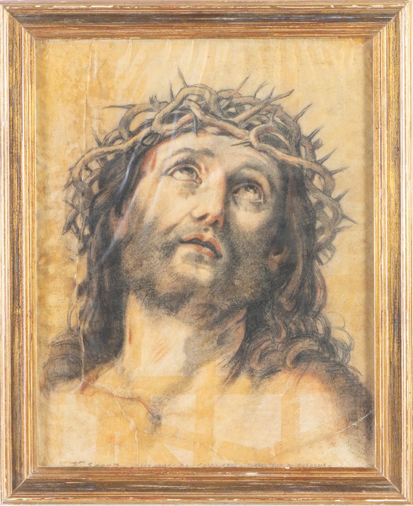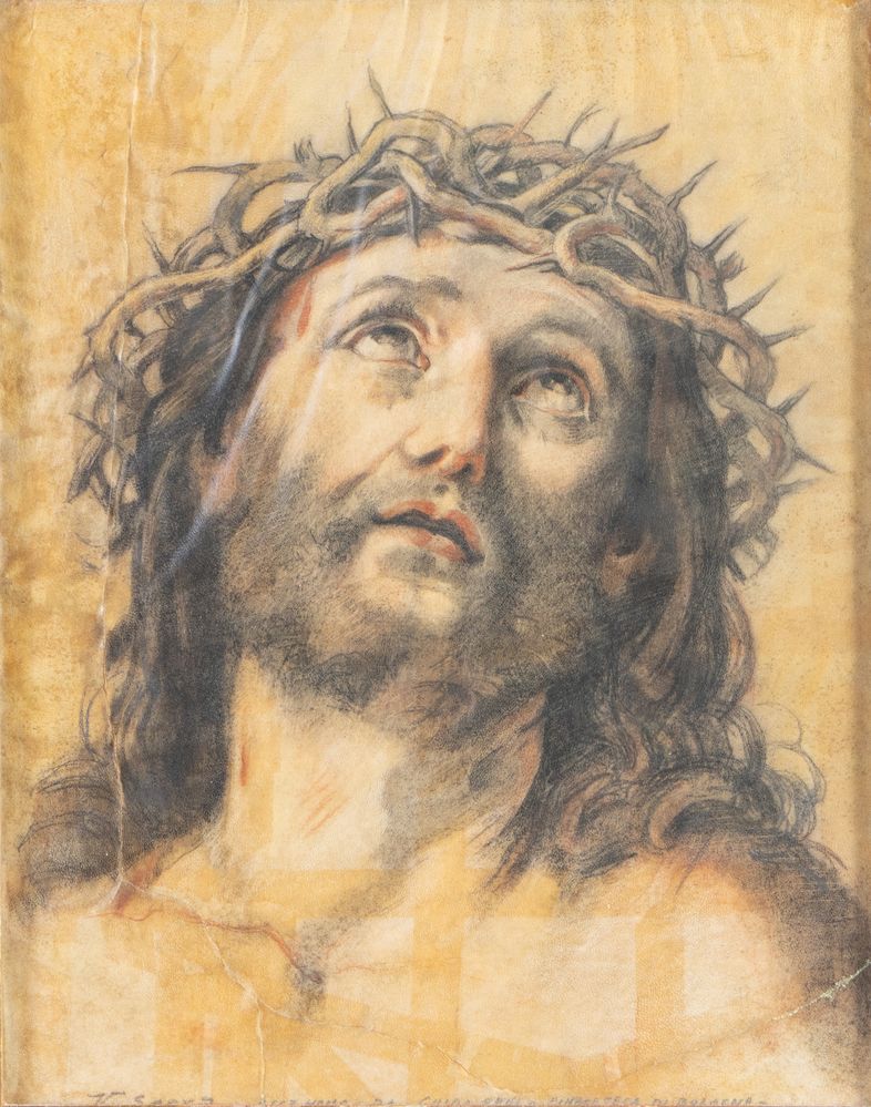 VALENTINO SERRA (San Giovanni in Persiceto 1888 – Baricella 1957) "Ecce Homo", 1952. Carboncino su carta di riso. Cm 41,5x33. Copia da Guido Reni.