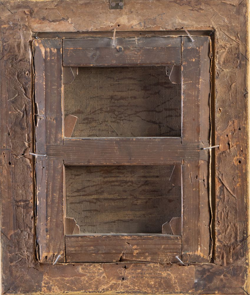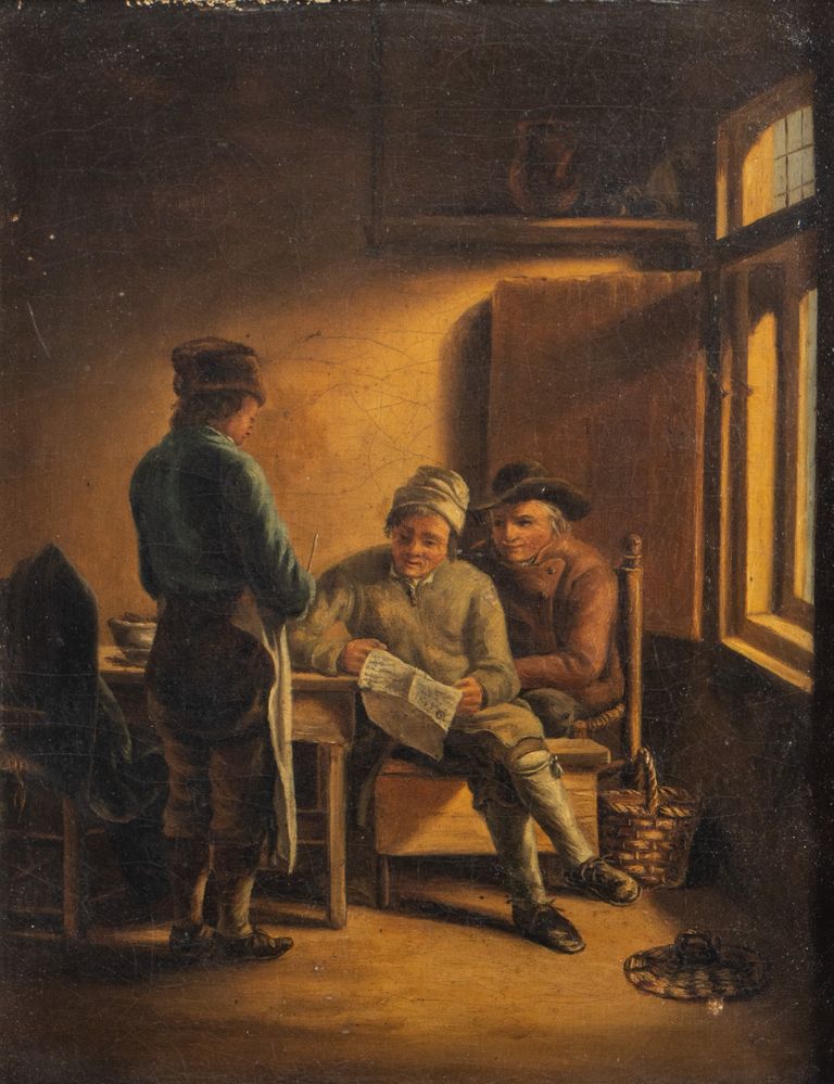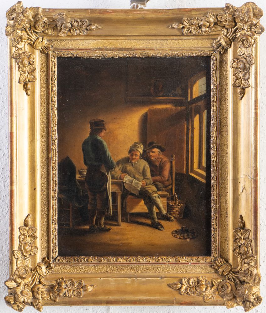 Maestro del XIX secolo. "Scena d'interno". Olio su tela. Cm 24,5x19.