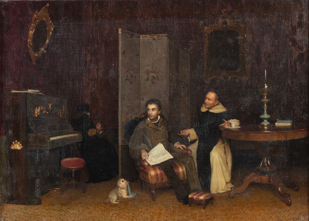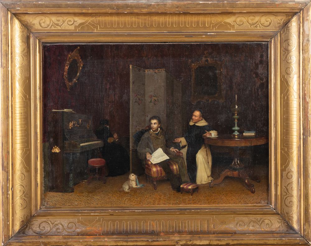 FRANCESCO MASTELLARI (Bologna 1828 - 1901) "Scena di interno". Olio su tela....