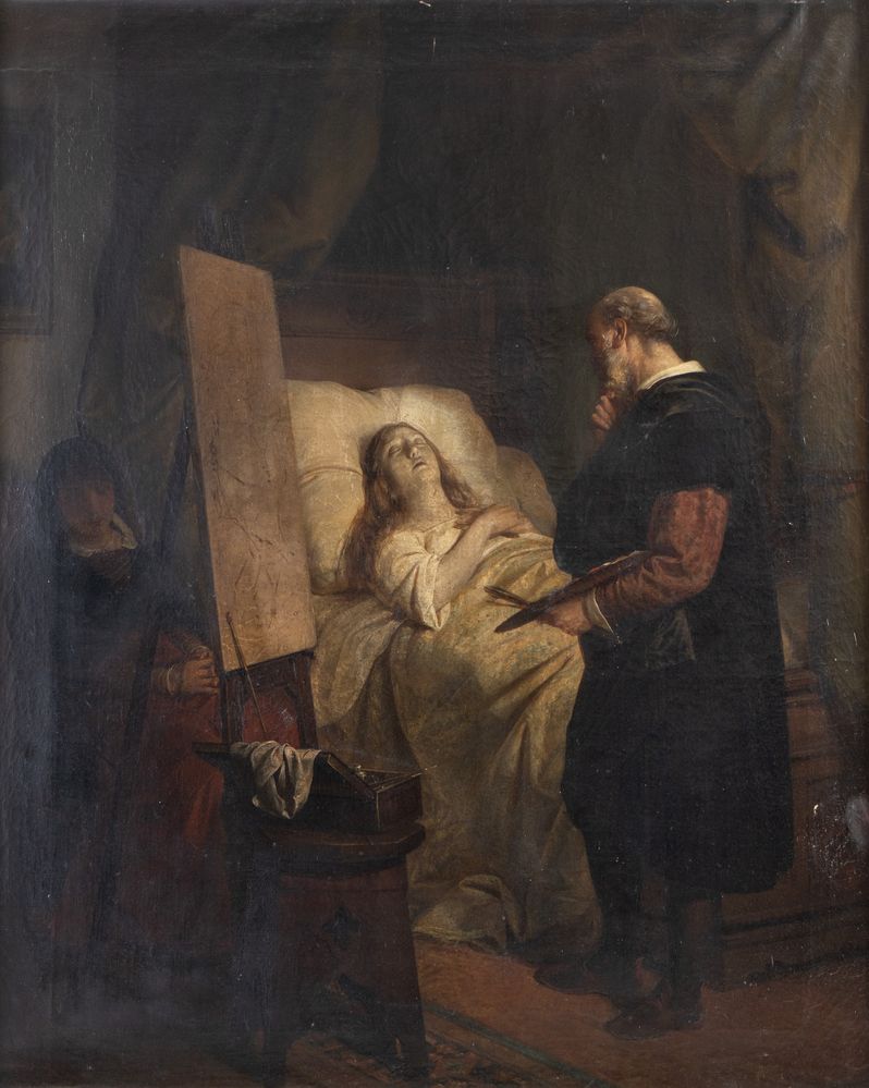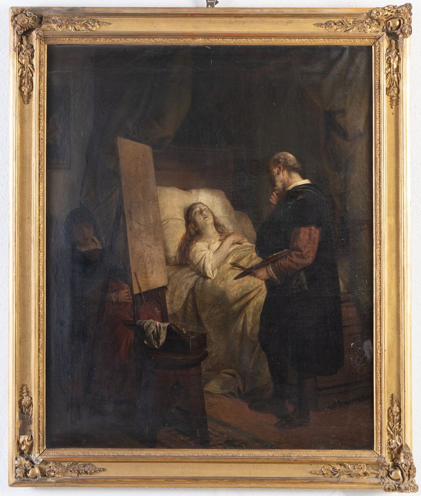 Maestro del XIX secolo. "Donna in fin di vita ritratta". Olio su tela. Cm 93x75. Opera firmata in basso a sinistra. Al retro reca scritta Tiziano fa ritratto a me morta.