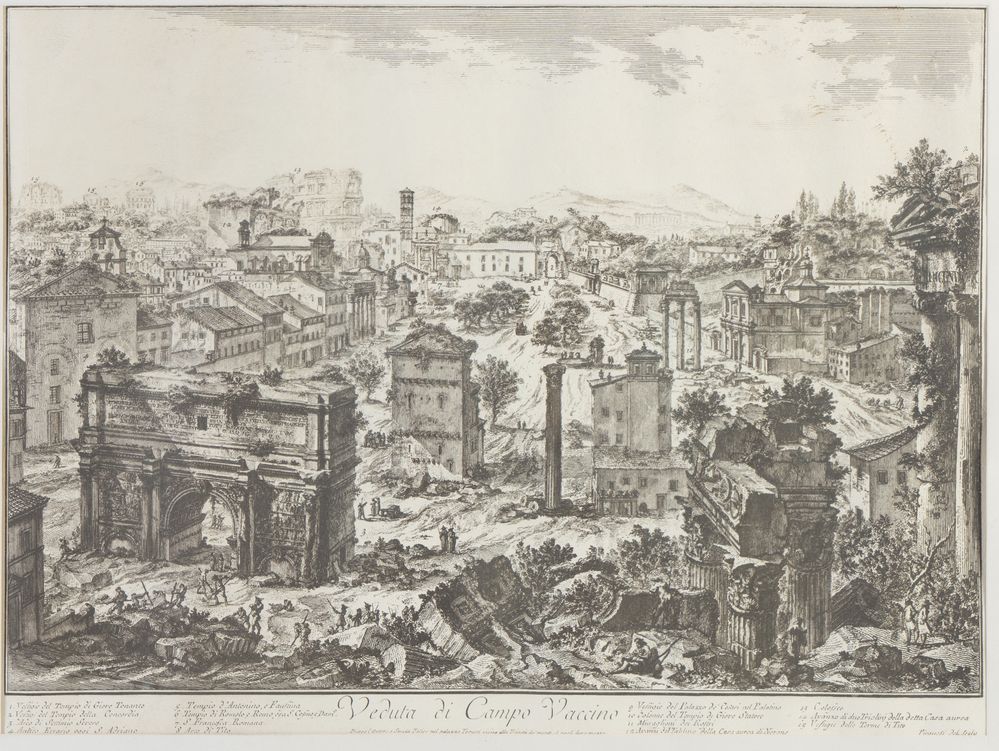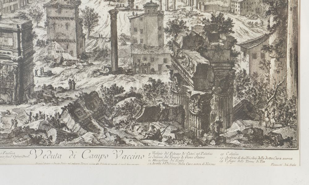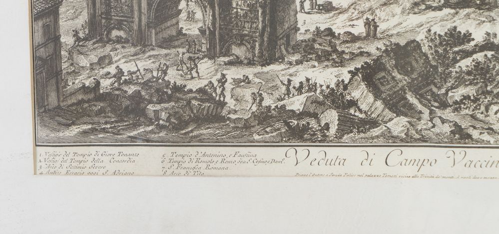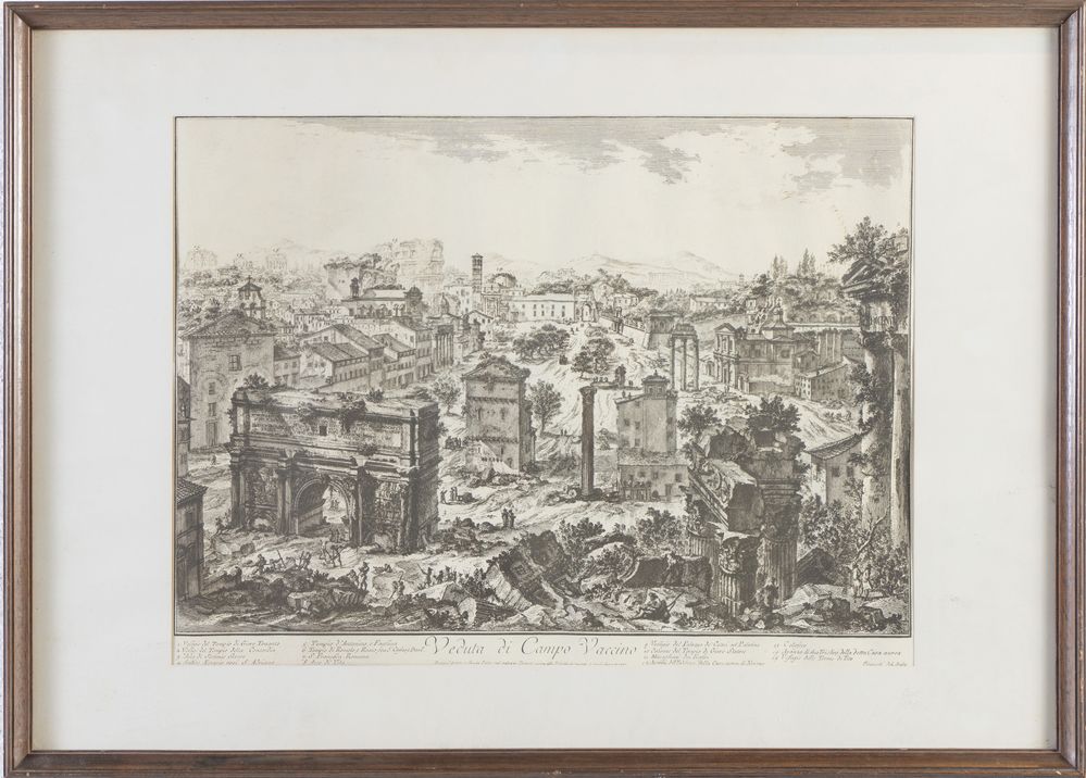 Maestro del XIX secolo. Copia di GIOVANNI BATTISTA PIRANESI (Venezia 1720 - Roma 1778) "Veduta di Campo Vaccino". Incisione su carta. Cm 41x56,5.