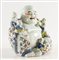 Figura di Buddha seduto contornato da bambini. Scultura in porcellana policroma. Cm 23x23x13,5. Sotto la base reca marchio.
