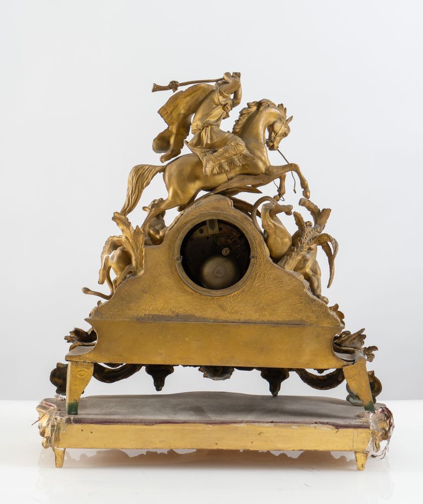 Orologio in antimonio dorato. Seconda metà del XIX secolo. Raffigurante scena di caccia. Cm 44x46x22. (difetti e mancanze)