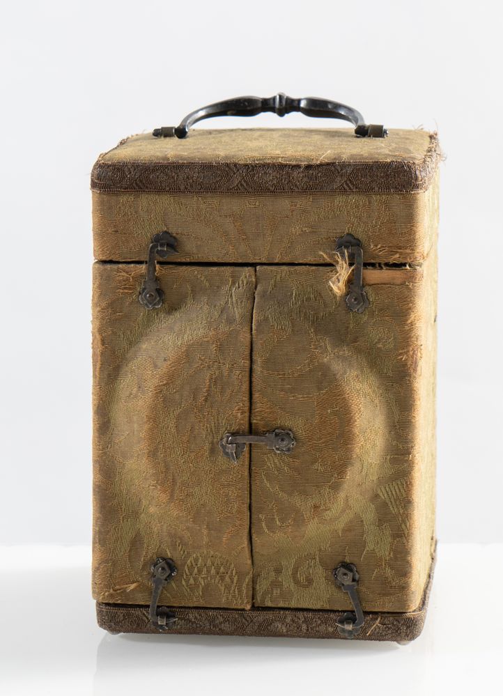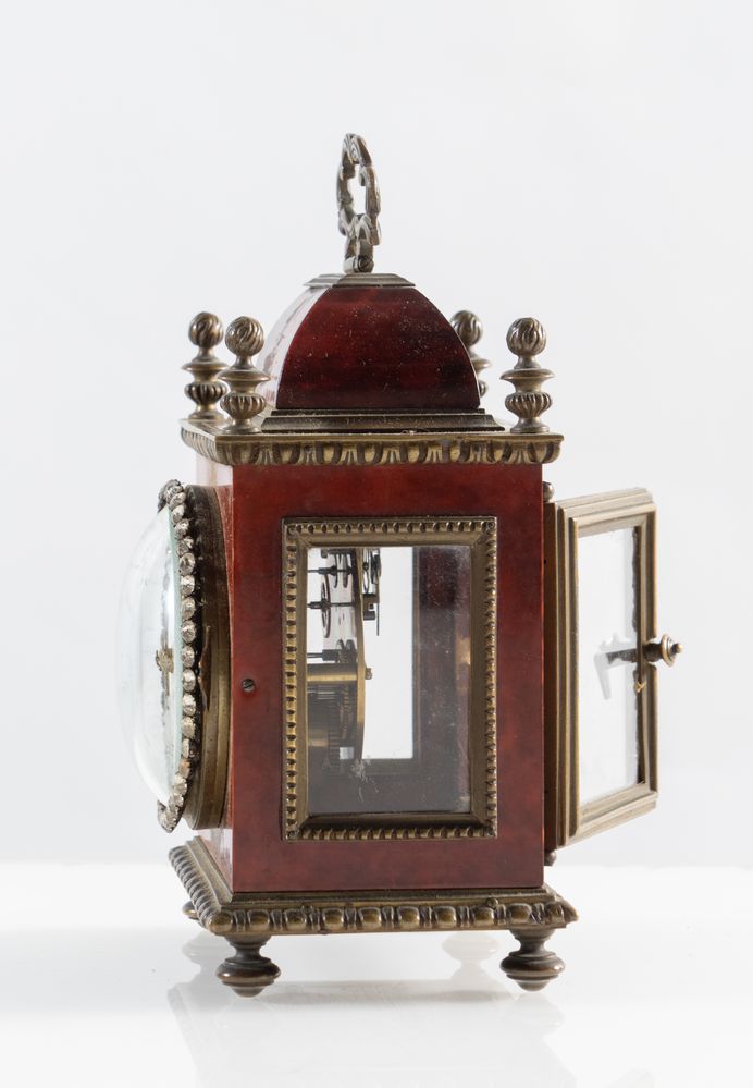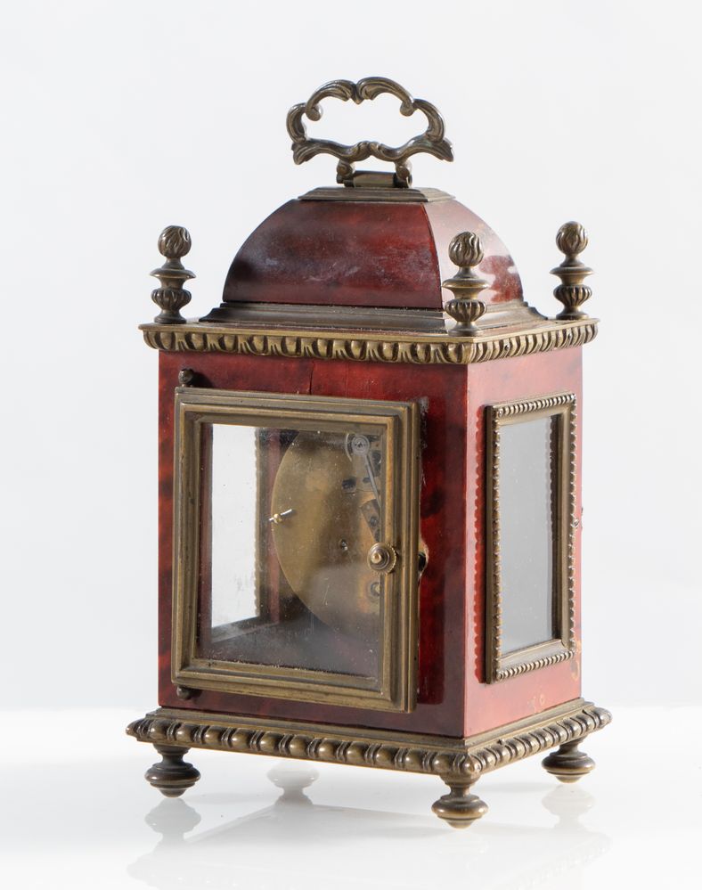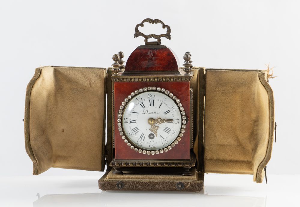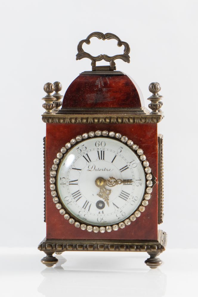 Orologio da tavolo in materiale prezioso e bronzo. XIX secolo. Quadrante marcato Dutertre, a Paris. Corredato di scatola originale. Dimensioni scatola: cm 20x14x13. Dimensioni orologio: cm 17x10,5x11. H. orologio con manico: cm 20,5.