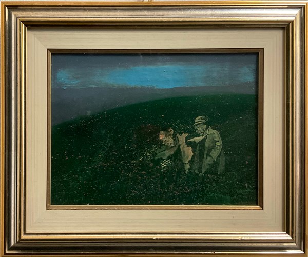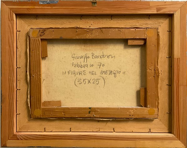 Giuseppe Banchieri "Figure nel paesaggio" 1970 olio su tela cm 25x35 firmato e d