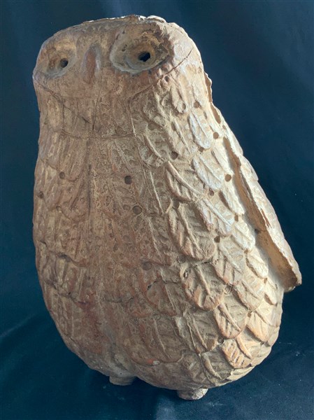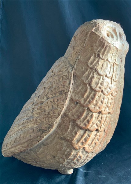 Scultura in terracotta dipinta raffigurante gufo h cm 32 (difetti e restauri)