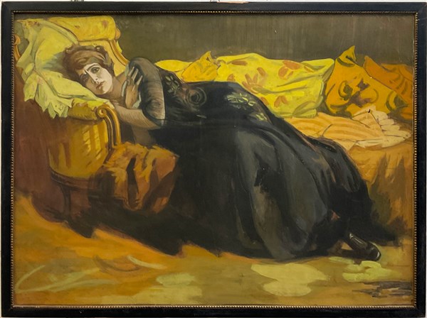 Bozzetto preparatorio a tecnica mista su carta applicata su cartoncino per il poster del film "L'amore che fa morire" , Mercedes films Milano