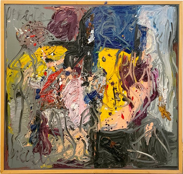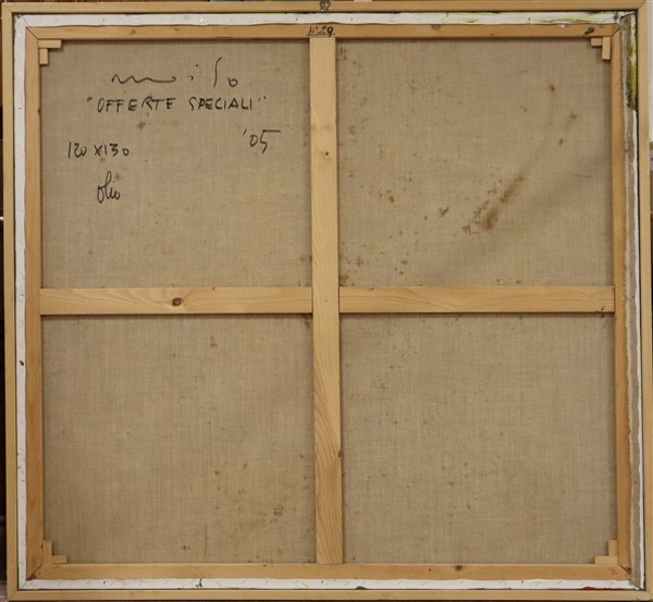 Giorgio Moiso "Offerte speciali" 2005 olio e assemblage su tela cm 120x130 firma