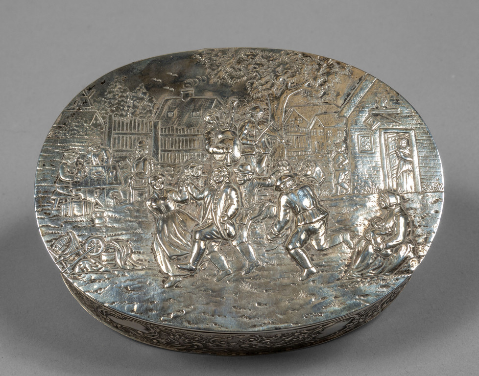 Scatola ovale in argento sbalzato con sena di festa paesana, Angers Francia sec.XVIII