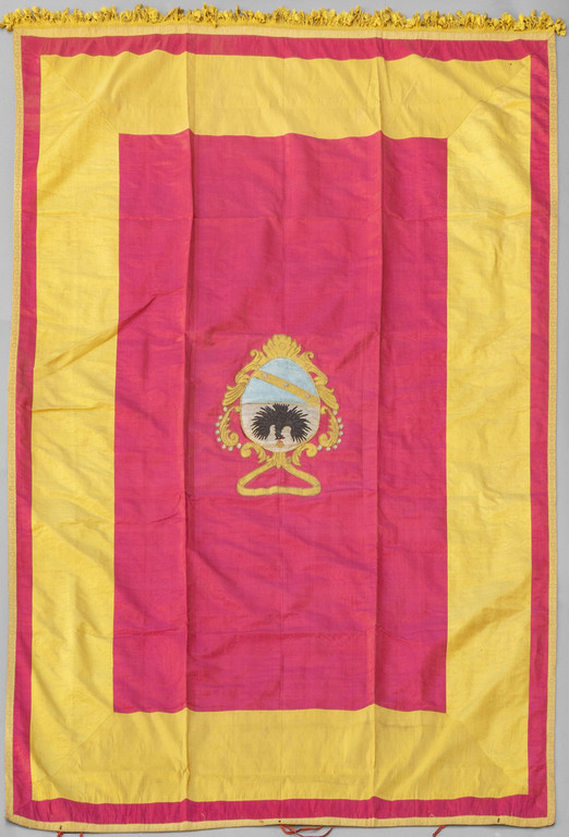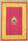 Antica portiera in seta rossa e gialla con stemma nobiliare al centro