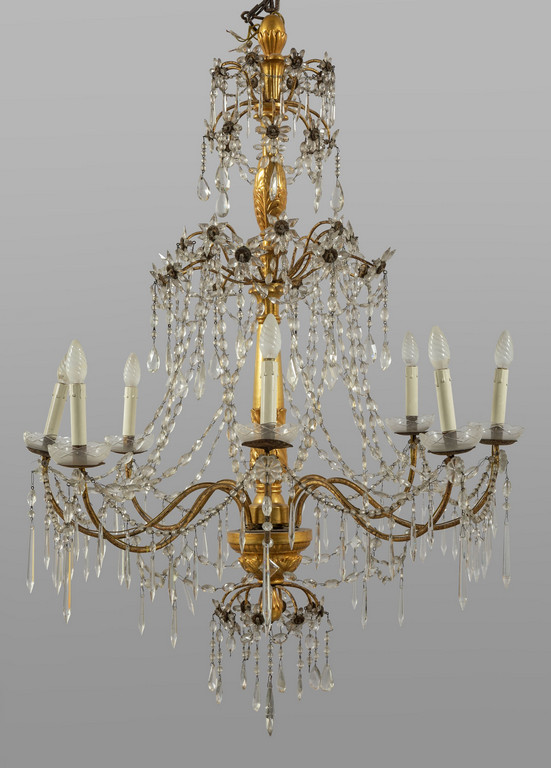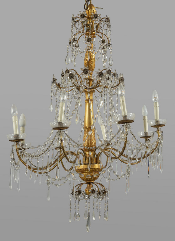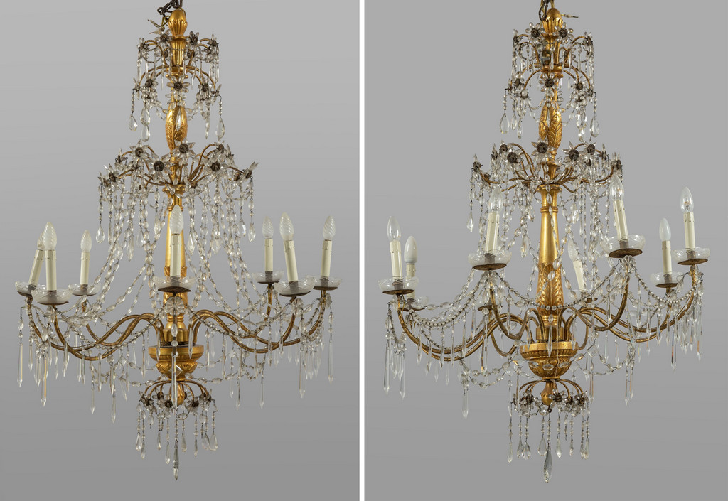 Coppia di lampadari Luigi XVI a otto luci, fusto in legno, ricca decorazione di cristalli, Genova inizi sec.XIX