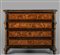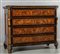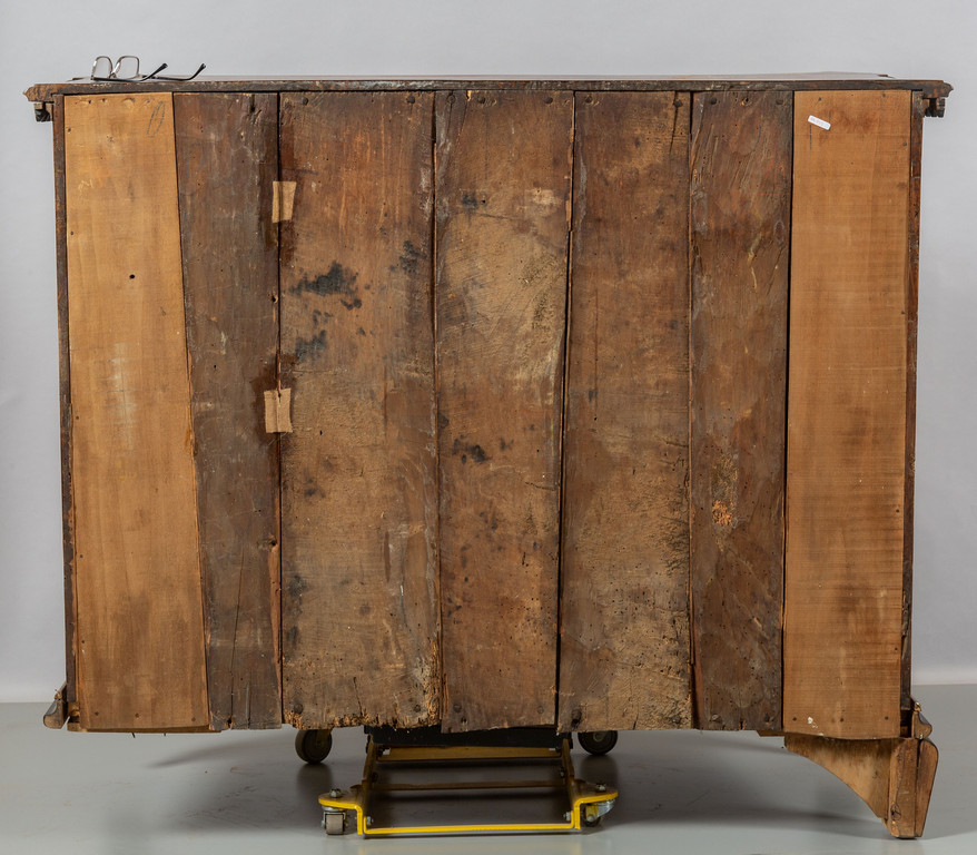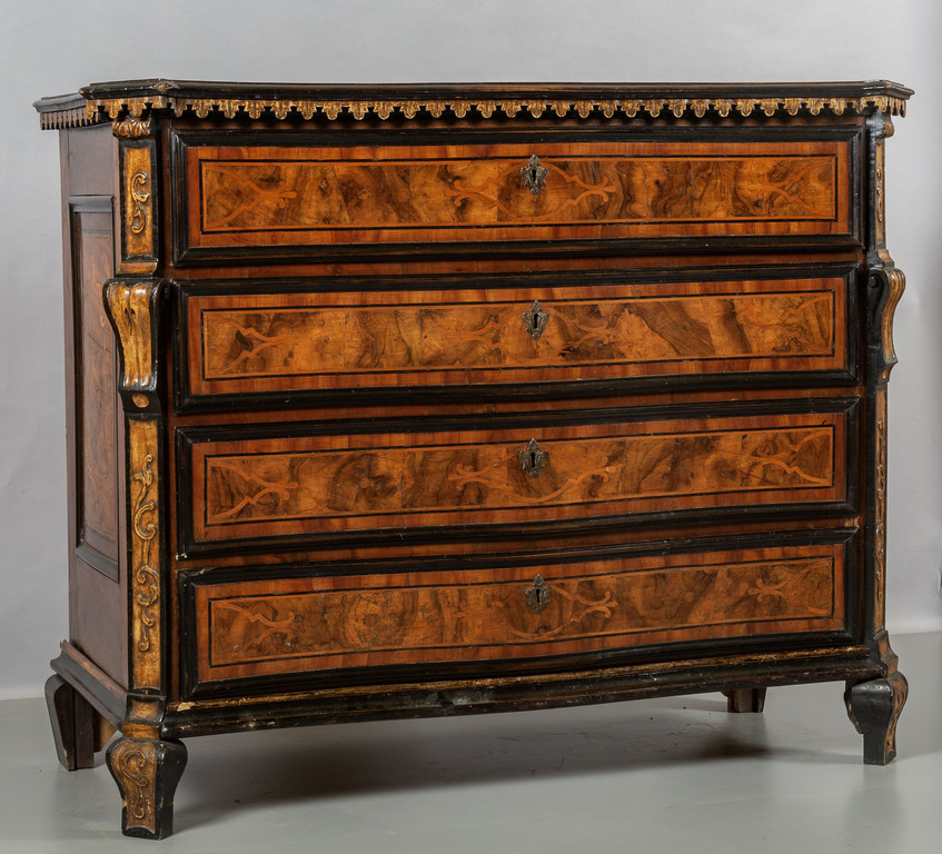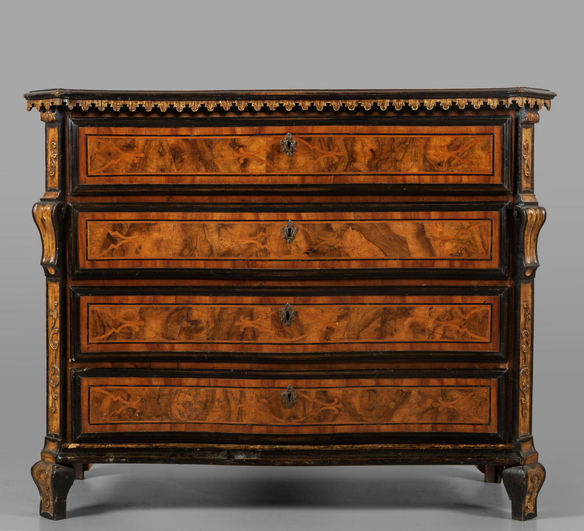 Comò Luigi XIV lastronato in radica di noce, spigoli scantonati arricchiti da profili in legno intagliato e dorato, Lombardia inizi sec. XVIII